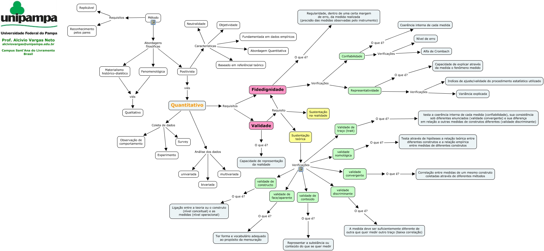 This Concept Map, created with IHMC CmapTools, has information related to: Pesquisa - Quantitativo - Requisitos, Método Requisitos Replicável, Método Abordagens filosóficas Materialismo histórico-dialético, Método Abordagens filosóficas Fenomenológica, Representatividade Verificações Variância explicada, Positivista Características Neutralidade, Confiabilidade O que é? Coerência interna de cada medida, Quantitativo Coleta de dados Survey, Positivista Características Objetividade, validade convergente O que é? Correlação entre medidas de um mesmo construto coletadas através de diferentes métodos, validade discriminante O que é? A medida deve ser suficientemente diferente de outra que quer medir outro traço (baixa correlação), validade de constructo O que é? Ligação entre a teoria ou o construto (nível conceitual) e as medidas (nível operacional), Representatividade Verificações Indíces de ajuste/validade do procedimento estatístico utilizado, Materialismo histórico-dialético viés Qualitativo, Quantitativo Análise dos dados univariada, Quantitativo Análise dos dados bivariada, Fidedignidade Verificações Representatividade, Confiabilidade Verificações Nível de erro, Sustentação teórica Verificações validade de face/aparente, Quantitativo Requisitos Validade, Sustentação teórica Verificações validade convergente