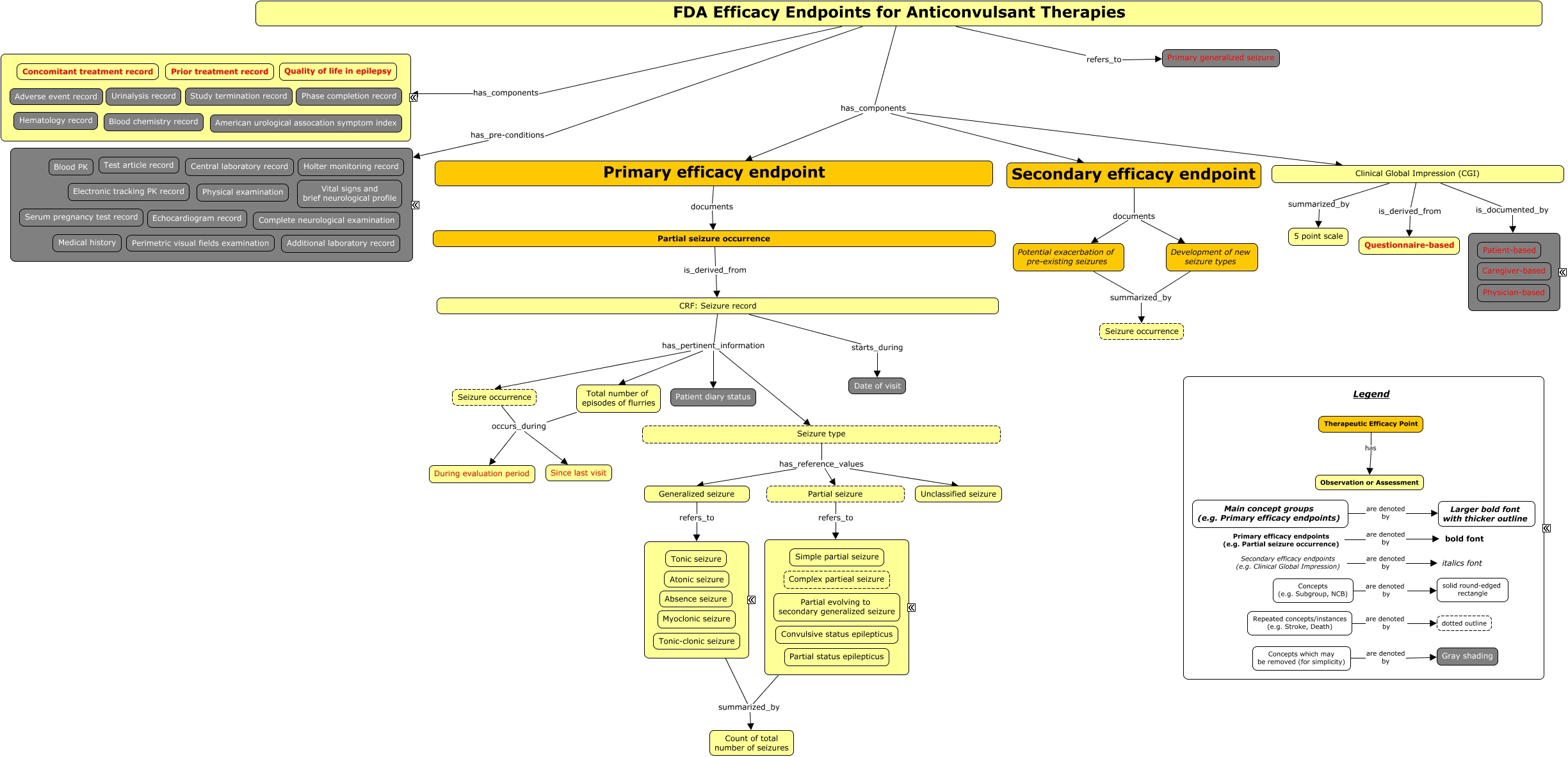 Esse mapa conceitual, produzido no IHMC CmapTools, tem a informação relacionada a: Anticonvulsant-CMAP-v3, Seizure type has_reference_values Partial seizure, Potential exacerbation of pre-existing seizures summarized_by Seizure occurrence, Clinical Global Impression (CGI) is_documented_by Reporting entity, FDA Efficacy Endpoints for Anticonvulsant Therapies has_components Secondary efficacy endpoint, Repeated concepts/instances (e.g. Stroke, Death) are denoted by dotted outline, Primary efficacy endpoints (e.g. Partial seizure occurrence) are denoted by bold font, Therapeutic Efficacy Point has Observation or Assessment, Seizure type has_reference_values Generalized seizure, FDA Efficacy Endpoints for Anticonvulsant Therapies has_pre-conditions CRF reports related to medical history and records, Primary efficacy endpoint documents Partial seizure occurrence, Total number of episodes of flurries occurs_during During evaluation period, CRF: Seizure record has_pertinent_information Seizure occurrence, FDA Efficacy Endpoints for Anticonvulsant Therapies has_components Primary efficacy endpoint, Partial seizure refers_to Partial seizure subtype, Concepts (e.g. Subgroup, NCB) are denoted by solid round-edged rectangle, Concepts which may be removed (for simplicity) are denoted by Gray shading, Generalized seizure subtype summarized_by Count of total number of seizures, Generalized seizure refers_to Generalized seizure subtype, Partial seizure occurrence is_derived_from CRF: Seizure record, Development of new seizure types summarized_by Seizure occurrence