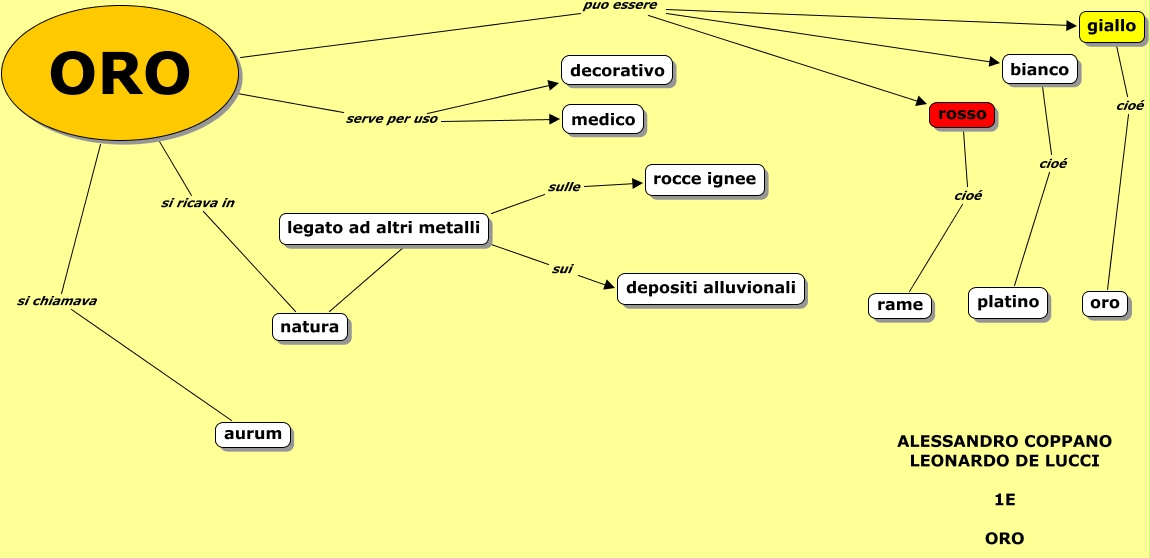 Questa Cmap, creata con IHMC CmapTools, contiene informazioni relative a: ORO.cmap, rosso cioé rame, natura ???? legato ad altri metalli, ORO puo essere giallo, ORO puo essere bianco, ORO puo essere rosso, ORO serve per uso medico, ORO si chiamava aurum, legato ad altri metalli sui depositi alluvionali, giallo cioé oro, ORO serve per uso decorativo, legato ad altri metalli sulle rocce ignee, bianco cioé platino, ORO si ricava in natura