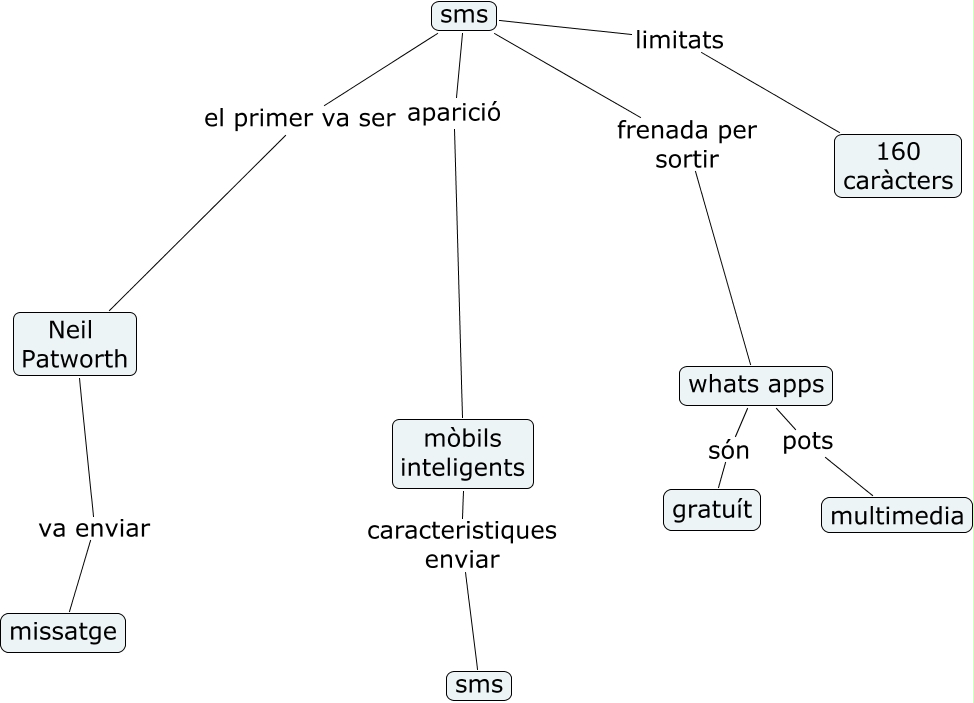 Aquest mapa conceptual conté informació relacionada amb: Sense títol 2, sms el primer va ser Neil Patworth, sms frenada per sortir whats apps, sms limitats 160 caràcters, whats apps són gratuít, sms aparició mòbils inteligents, whats apps pots multimedia, Neil Patworth va enviar missatge, mòbils inteligents caracteristiques enviar sms