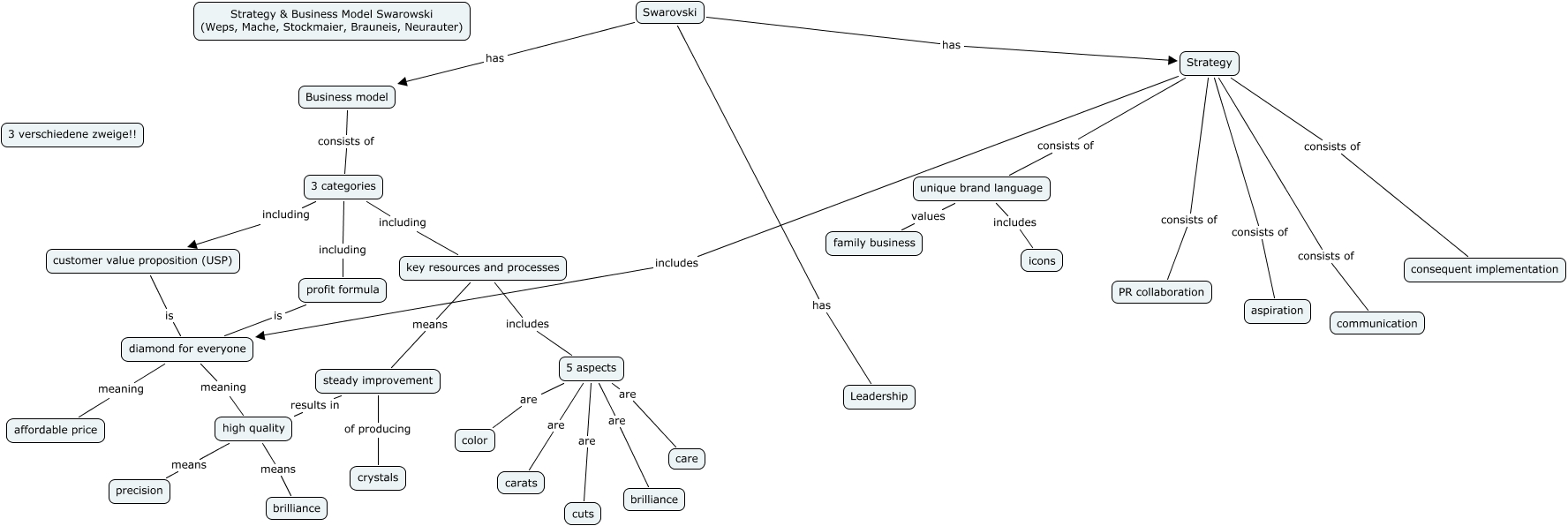 Dieses mit IHMC CmapTools erstellte CMap hat Informationen bezüglich: strategy, key resources and processes means steady improvement, Strategy consists of consequent implementation, Strategy consists of aspiration, steady improvement results in high quality, 3 categories including key resources and processes, high quality means brilliance, Swarovski has Business model, profit formula is diamond for everyone, 5 aspects are cuts, Strategy consists of communication, 3 categories including profit formula, unique brand language values family business, Strategy consists of unique brand language, key resources and processes includes 5 aspects, 5 aspects are carats, high quality means precision, 3 categories including customer value proposition (USP), Business model consists of 3 categories, diamond for everyone meaning high quality, unique brand language includes icons