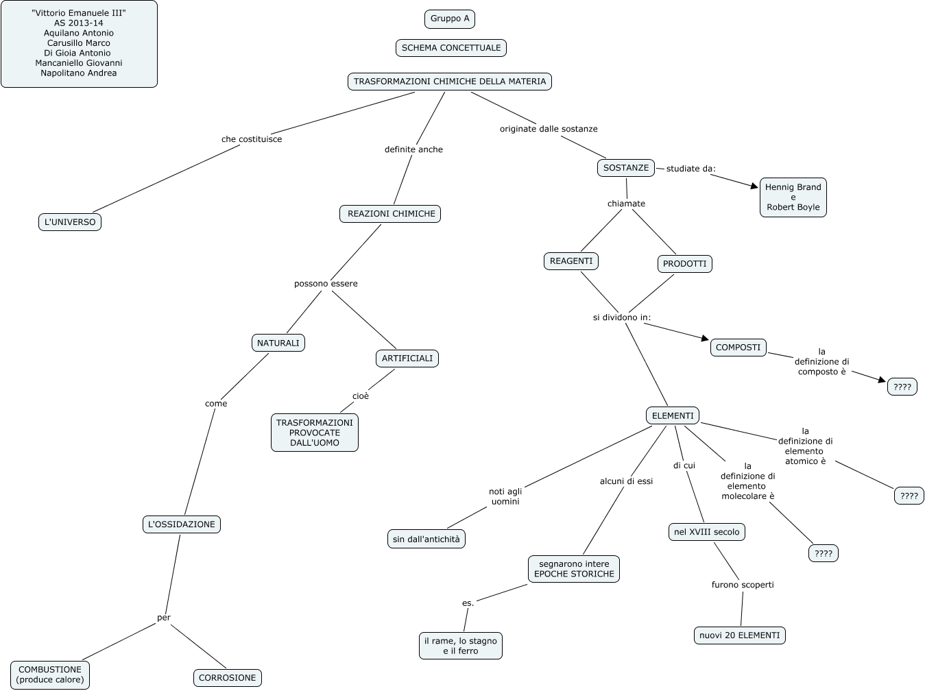 Questa Cmap, creata con IHMC CmapTools, contiene informazioni relative a: GA Elementi e Composti - 49, ELEMENTI di cui nel XVIII secolo, REAZIONI CHIMICHE possono essere NATURALI, nel XVIII secolo furono scoperti nuovi 20 ELEMENTI, ARTIFICIALI cioè TRASFORMAZIONI PROVOCATE DALL'UOMO, segnarono intere EPOCHE STORICHE es. il rame, lo stagno e il ferro, ELEMENTI la definizione di elemento atomico è ????, TRASFORMAZIONI CHIMICHE DELLA MATERIA definite anche REAZIONI CHIMICHE, L'OSSIDAZIONE per CORROSIONE, ELEMENTI la definizione di elemento molecolare è ????, REAGENTI si dividono in: ELEMENTI, COMPOSTI la definizione di composto è ????, L'OSSIDAZIONE per COMBUSTIONE (produce calore), TRASFORMAZIONI CHIMICHE DELLA MATERIA che costituisce L'UNIVERSO, ELEMENTI noti agli uomini sin dall'antichità, SOSTANZE chiamate REAGENTI, NATURALI come L'OSSIDAZIONE, SOSTANZE chiamate PRODOTTI, SOSTANZE studiate da: Hennig Brand e Robert Boyle, ELEMENTI alcuni di essi segnarono intere EPOCHE STORICHE, REAGENTI si dividono in: COMPOSTI