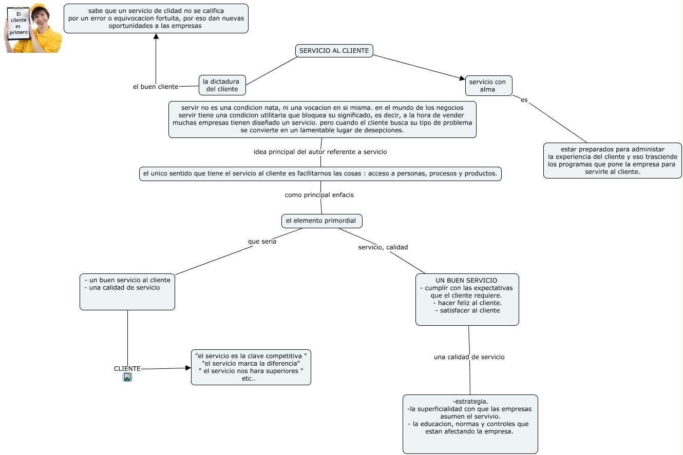 Este Cmap, tiene información relacionada con: hablemos claro sobre servicio, - un buen servicio al cliente - una calidad de servicio CLIENTE "el servicio es la clave competitiva " "el servicio marca la diferencia" " el servicio nos hara superiores " etc.., UN BUEN SERVICIO - cumplir con las expectativas que el cliente requiere. - hacer feliz al cliente. - satisfacer al cliente una calidad de servicio -estrategia. -la superficialidad con que las empresas asumen el servivio. - la educacion, normas y controles que estan afectando la empresa., la dictadura del cliente el buen cliente sabe que un servicio de clidad no se califica por un error o equivocacion fortuita, por eso dan nuevas oportunidades a las empresas, servicio con alma es estar preparados para administar la experiencia del cliente y eso trasciende los programas que pone la empresa para servirle al cliente., SERVICIO AL CLIENTE importancia servicio con alma, el elemento primordial que seria - un buen servicio al cliente - una calidad de servicio, servir no es una condicion nata, ni una vocacion en si misma. en el mundo de los negocios servir tiene una condicion utilitaria que bloquea su significado, es decir, a la hora de vender muchas empresas tienen diseñado un servicio. pero cuando el cliente busca su tipo de problema se convierte en un lamentable lugar de desepciones. idea principal del autor referente a servicio el unico sentido que tiene el servicio al cliente es facilitarnos las cosas : acceso a personas, procesos y productos., el elemento primordial servicio, calidad UN BUEN SERVICIO - cumplir con las expectativas que el cliente requiere. - hacer feliz al cliente. - satisfacer al cliente, SERVICIO AL CLIENTE ???? la dictadura del cliente, el unico sentido que tiene el servicio al cliente es facilitarnos las cosas : acceso a personas, procesos y productos. como principal enfacis el elemento primordial