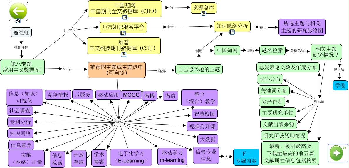 此概念图以 IHMC CmapTools 创建, 内含信息有关于: 第八专题 常用中文库1(12级), 推荐的主题或主题词中 (可自拟) 包括 视频公开课, 推荐的主题或主题词中 (可自拟) 包括 微博, 相关主题 研究情况? 可包括 最新、被引最高及 下载量最高的前五篇 文献属性信息包括摘要, 第八专题 常用中文数据库1 2、在 推荐的主题或主题词中 (可自拟), 推荐的主题或主题词中 (可自拟) 包括 移动应用, 相关主题 研究情况? 可包括 研究所获资助情况, 第八专题 常用中文数据库1 1、学习 维普 中文科技期刊数据库(CSTJ), 相关主题 研究情况? 可包括 主要研究单位, 相关主题 研究情况? 可包括 学科分布, 推荐的主题或主题词中 (可自拟) 包括 移动学习 m-learning, 推荐的主题或主题词中 (可自拟) 包括 MOOC, 第八专题 常用中文数据库1 1、学习 万方知识服务平台, 推荐的主题或主题词中 (可自拟) 包括 开放 存取, 推荐的主题或主题词中 (可自拟) 包括 信管专业 信息, 推荐的主题或主题词中 (可自拟) 包括 智慧校园, 推荐的主题或主题词中 (可自拟) 包括 微信, 推荐的主题或主题词中 (可自拟) 包括 专利分析, 题名检索 分析总结 相关主题 研究情况?, 推荐的主题或主题词中 (可自拟) 包括 知识网络, 推荐的主题或主题词中 (可自拟) 包括 信息 检索