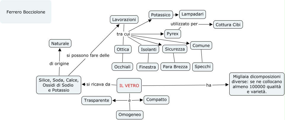 Questa Cmap, creata con IHMC CmapTools, contiene informazioni relative a: Mappa vetro Bocciolone Ferrero, Lavorazioni tra cui Ottica, IL VETRO ha Migliaia dicomposizioni diverse: se ne collocano almeno 100000 qualità e varietà., IL VETRO si ricava da Silice, Soda, Calce, Ossidi di Sodio e Potassio, Isolanti ???? Finestra, IL VETRO è Omogeneo, Lavorazioni tra cui Potassico, Lavorazioni tra cui Isolanti, Potassico ???? Lampadari, Comune ???? Specchi, Lavorazioni tra cui Comune, IL VETRO è Compatto, Lavorazioni tra cui Pyrex, IL VETRO è Trasparente, Silice, Soda, Calce, Ossidi di Sodio e Potassio si possono fare delle Lavorazioni, Lavorazioni tra cui Sicurezza, Silice, Soda, Calce, Ossidi di Sodio e Potassio di origine Naturale, Sicurezza ???? Para Brezza, Pyrex utilizzato per Cottura Cibi, Ottica ???? Occhiali
