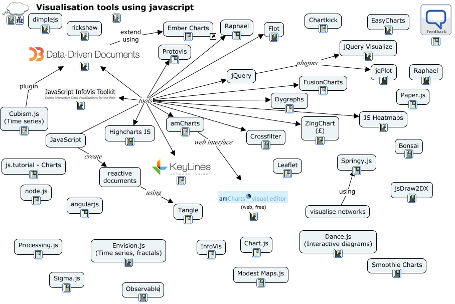 This Concept Map, created with IHMC CmapTools, has information related to: Visualisation tools - javascript, JavaScript tools, JavaScript tools, jQuery plugins jqPlot, JavaScript tools Raphaël, JavaScript tools, JavaScript tools Highcharts JS, JavaScript tools Protovis, JavaScript tools amCharts, reactive documents using Tangle, JavaScript tools JS Heatmaps, JavaScript tools Dygraphs, visualise networks using Springy.js, Cubism.js (Time series) plugin, JavaScript tools Crossfilter, JavaScript tools Flot, JavaScript tools ZingChart (£), jQuery plugins jQuery Visualize, JavaScript tools jQuery, JavaScript tools FusionCharts, JavaScript create reactive documents