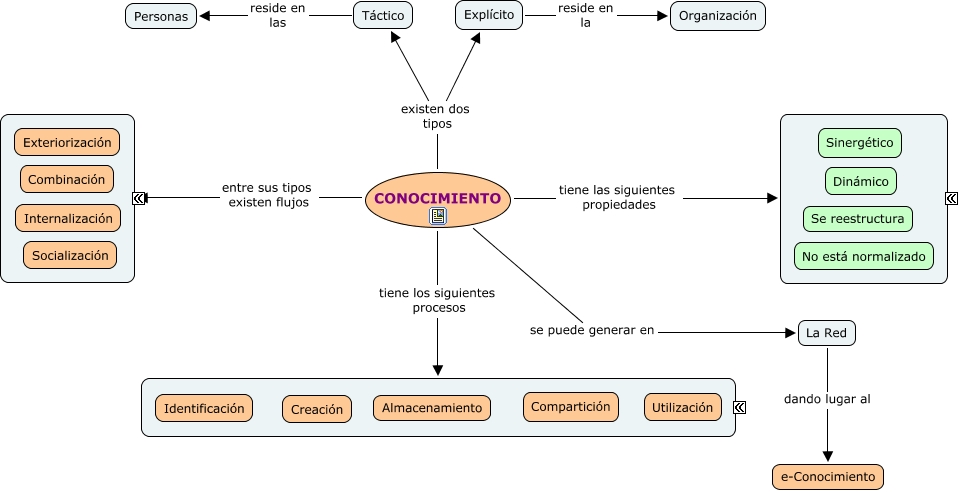 Este Cmap, tiene información relacionada con: Conocimiento, CONOCIMIENTO entre sus tipos existen flujos ????, La Red dando lugar al e-Conocimiento, CONOCIMIENTO tiene los siguientes procesos ????, CONOCIMIENTO existen dos tipos Explícito, Explícito reside en la Organización, CONOCIMIENTO se puede generar en La Red, CONOCIMIENTO existen dos tipos Táctico, CONOCIMIENTO tiene las siguientes propiedades ????, Táctico reside en las Personas