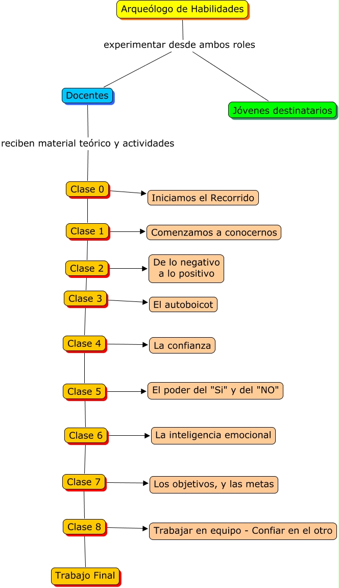 Este Cmap, tiene información relacionada con: Arqueólogo de Habilidades, Clase 3 El autoboicot, Arqueólogo de Habilidades experimentar desde ambos roles Jóvenes destinatarios, Docentes reciben material teórico y actividades Clase 0, Clase 8 Trabajo Final, Clase 8 Trabajar en equipo - Confiar en el otro, Clase 4 Clase 5, Clase 2 Clase 3, Clase 6 Clase 7, Clase 5 El poder del "Si" y del "NO", Clase 7 Los objetivos, y las metas, Clase 0 Clase 1, Clase 2 De lo negativo a lo positivo, Clase 0 Iniciamos el Recorrido, Clase 1 Comenzamos a conocernos, Arqueólogo de Habilidades experimentar desde ambos roles Docentes, Clase 3 Clase 4, Clase 5 Clase 6, Clase 4 La confianza, Clase 1 Clase 2, Clase 7 Clase 8