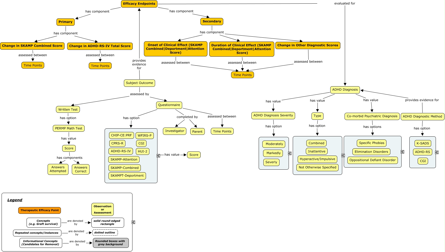 This Concept Map, created with IHMC CmapTools, has information related to: ADHD Efficacy Framework - v1, Questionnaire has option ????, Duration of Clinical Effect (SKAMP Combined|Deportment|Attention Score) assessed between Time Points, Subject Outcome assessed by Written Test, Score has components Answers Correct, Efficacy Endpoints evaluated for ADHD Diagnosis, Subject Outcome provides evidence for Efficacy Endpoints, Secondary has component Duration of Clinical Effect (SKAMP Combined|Deportment|Attention Score), Questionnaire completed by Investigator, Questionnaire completed by Parent, Efficacy Endpoints has component Primary, Primary has component Change in ADHD-RS-IV Total Score, Concepts (e.g. Graft survival) are denoted by solid round-edged rectangle, Concepts (e.g. Graft survival) are denoted by solid round-edged rectangle, Questionnaire assessed between Time Points, Subject Outcome assessed by Questionnaire, Type has option ????, ADHD Diagnostic Method has option ????, Secondary has component Onset of Clinical Effect (SKAMP Combined|Deportment|Attention Score), Primary has component Change in SKAMP Combined Score, Co-morbid Psychiatric Diagnosis has options ????