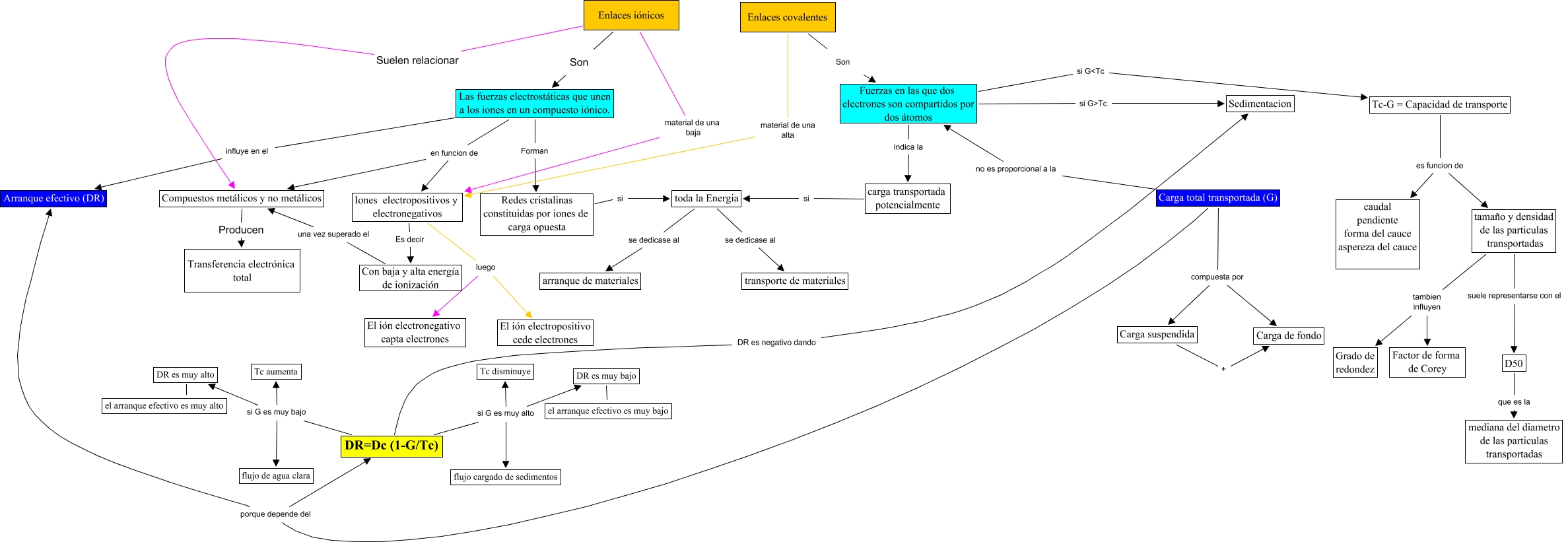 Este Cmap, tiene información relacionada con: Mapa conceptual de química, toda la Energia se dedicase al transporte de materiales, Enlaces covalentes Son Fuerzas en las que dos electrones son compartidos por dos átomos, DR=Dc (1-G/Tc) si G es muy bajo Tc aumenta, Fuerzas en las que dos electrones son compartidos por dos átomos si G<Tc Tc-G = Capacidad de transporte, Compuestos metálicos y no metálicos Producen Transferencia electrónica total, Las fuerzas electrostáticas que unen a los iones en un compuesto iónico. en funcion de Iones electropositivos y electronegativos, Carga total transportada (G) no es proporcional a la Fuerzas en las que dos electrones son compartidos por dos átomos, Enlaces iónicos Suelen relacionar Compuestos metálicos y no metálicos, DR=Dc (1-G/Tc) DR es negativo dando Sedimentacion, DR=Dc (1-G/Tc) si G es muy bajo flujo de agua clara, Carga total transportada (G) compuesta por Carga suspendida, Enlaces iónicos material de una baja Iones electropositivos y electronegativos, Redes cristalinas constituidas por iones de carga opuesta si toda la Energia, Las fuerzas electrostáticas que unen a los iones en un compuesto iónico. Forman Redes cristalinas constituidas por iones de carga opuesta, carga transportada potencialmente si toda la Energia, Tc-G = Capacidad de transporte es funcion de tamaño y densidad de las particulas transportadas, tamaño y densidad de las particulas transportadas suele representarse con el D50, Las fuerzas electrostáticas que unen a los iones en un compuesto iónico. en funcion de Compuestos metálicos y no metálicos, Carga total transportada (G) porque depende del Arranque efectivo (DR), Iones electropositivos y electronegativos Es decir Con baja y alta energía de ionización