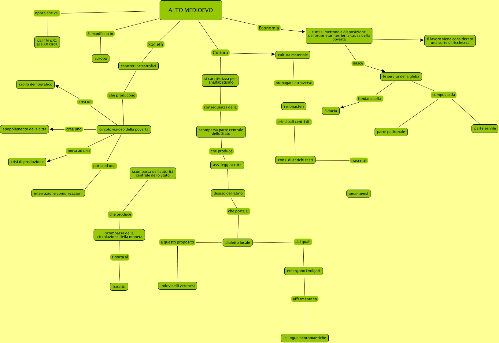 Questa Cmap, creata con IHMC CmapTools, contiene informazioni relative a: Altomedioevo_Repossi, ALTO MEDIOEVO epoca che va dal 476 d.C. al 1000 circa, dialetto locale dai quali emergono i volgari, ALTO MEDIOEVO Si manifesta in Europa, emergono i volgari affermeranno le lingue neoromantiche, circolo vizioso della povertà crea uno spopolamento delle città, disuso del latino che porta al dialetto locale, tutti si mettono a disposizione dei proprietari terrieri a causa della povertà ???? il lavoro viene considerato una sorte di ricchezza, ALTO MEDIOEVO Società caratteri catastrofici, le servitù della gleba composta da parte servile, ass. leggi scritte ???? disuso del latino, circolo vizioso della povertà porta ad una crisi di produzione, ALTO MEDIOEVO Cultura si caratterizza per l'analfabetismo, scomparsa parte centrale dello Stato che produce ass. leggi scritte, i monasteri principali centri di cons. di antichi testi, cons. di antichi testi trascritti amanuensi, si caratterizza per l'analfabetismo conseguenza della scomparsa parte centrale dello Stato, ALTO MEDIOEVO Cultura cultura materiale, ALTO MEDIOEVO Economia tutti si mettono a disposizione dei proprietari terrieri a causa della povertà, scomparsa dell'autorità centrale dello Stato che produce scomparsa della circolazione della moneta, le servitù della gleba fondata sulla Fiducia