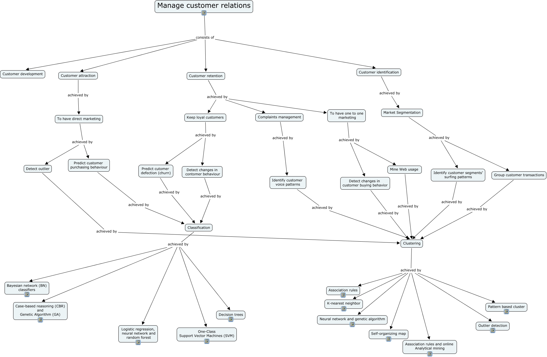 This Concept Map, created with IHMC CmapTools, has information related to: 2005, Mine Web usage achieved by Clustering, Clustering achieved by Self-organizing map, Customer retention achieved by Keep loyal customers, Classification achieved by Case-based reasoning (CBR) and Genetic Algorithm (GA), Manage customer relations consists of Customer identification, Identify customer segments’ surfing patterns achieved by Clustering, Group customer transactions achieved by Clustering, Manage customer relations consists of Customer retention, Predict customer purchasing behaviour achieved by Classification, Clustering achieved by K-nearest neighbor, Manage customer relations consists of Customer development, Predict cutomer defection (churn) achieved by Classification, Clustering achieved by Association rules and online Analytical mining, Detect changes in contomer behaviour achieved by Classification, Classification achieved by Decision trees, Clustering achieved by Association rules, Clustering achieved by Outlier detection, Classification achieved by Bayesian network (BN) classifiers, Customer identification achieved by Market Segmentation, Classification achieved by One-Class Support Vector Machines (SVM)