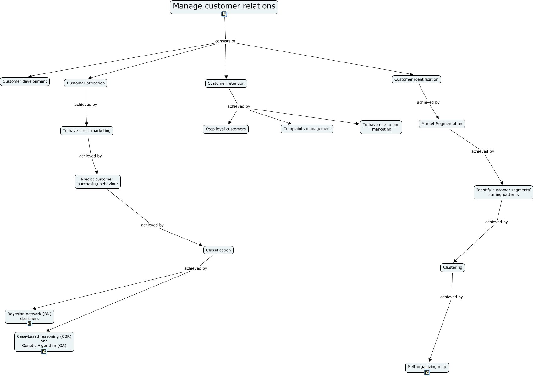 This Concept Map, created with IHMC CmapTools, has information related to: 2003, Clustering achieved by Self-organizing map, Customer retention achieved by Keep loyal customers, Classification achieved by Case-based reasoning (CBR) and Genetic Algorithm (GA), Manage customer relations consists of Customer identification, Identify customer segments’ surfing patterns achieved by Clustering, Manage customer relations consists of Customer retention, Predict customer purchasing behaviour achieved by Classification, Manage customer relations consists of Customer development, Classification achieved by Bayesian network (BN) classifiers, Customer identification achieved by Market Segmentation, Customer attraction achieved by To have direct marketing, Customer retention achieved by To have one to one marketing, Market Segmentation achieved by Identify customer segments’ surfing patterns, Customer retention achieved by Complaints management, To have direct marketing achieved by Predict customer purchasing behaviour, Manage customer relations consists of Customer attraction