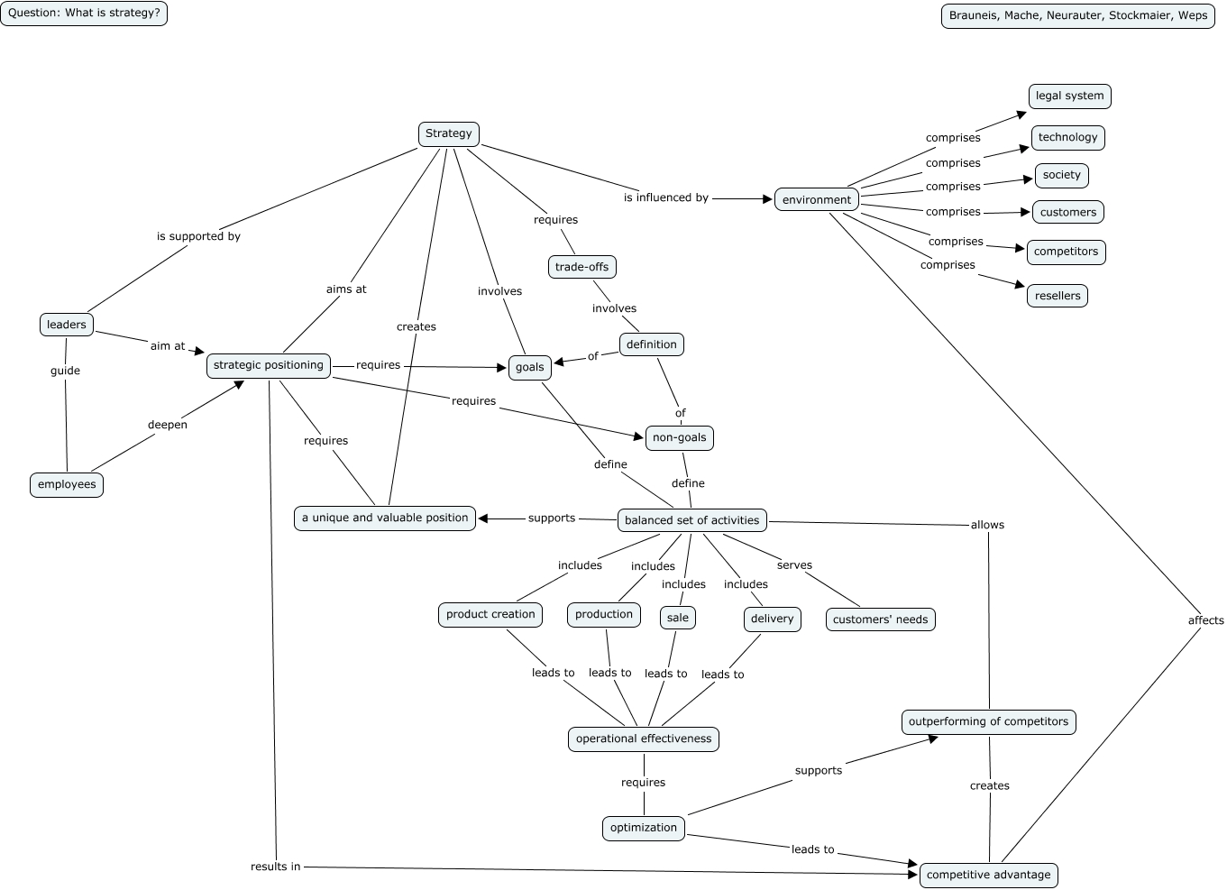 Dieses mit IHMC CmapTools erstellte CMap hat Informationen bezüglich: Strategy_general, Strategy involves goals, Strategy is influenced by environment, definition of goals, environment comprises legal system, balanced set of activities includes product creation, balanced set of activities serves customers' needs, strategic positioning requires non-goals, optimization supports outperforming of competitors, definition of non-goals, environment affects competitive advantage, leaders aim at strategic positioning, strategic positioning results in competitive advantage, environment comprises competitors, sale leads to operational effectiveness, balanced set of activities includes delivery, environment comprises resellers, optimization leads to competitive advantage, goals define balanced set of activities, environment comprises technology, Strategy requires trade-offs