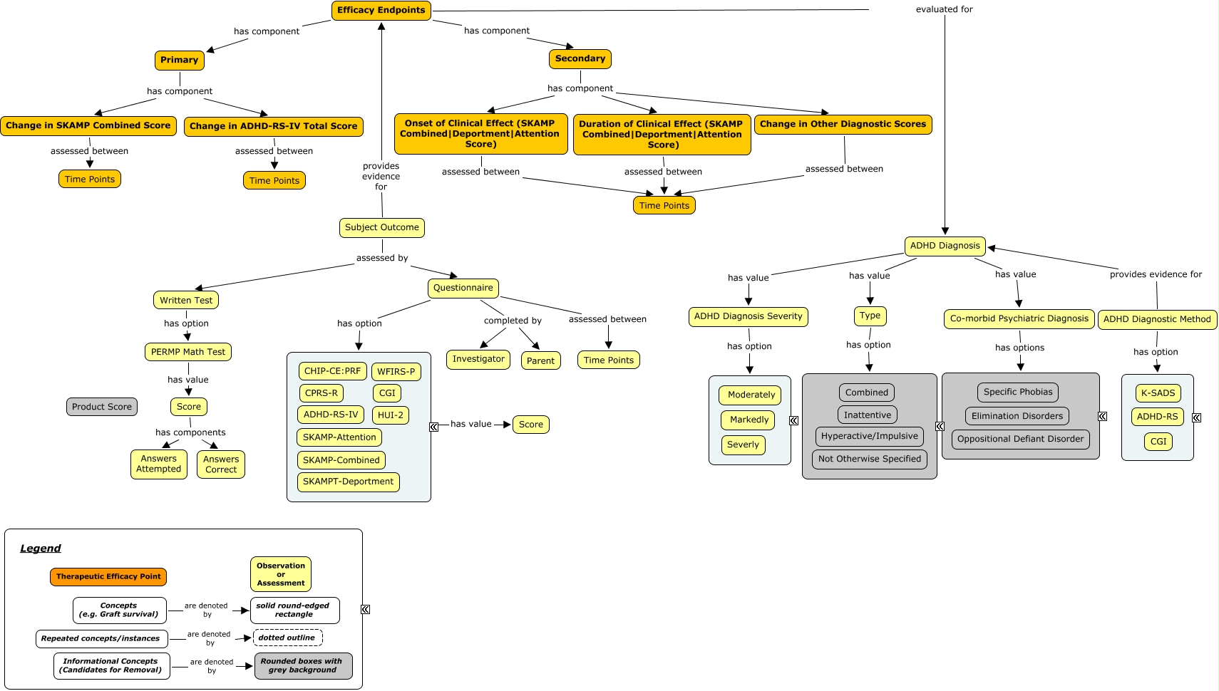 This Concept Map, created with IHMC CmapTools, has information related to: ADHD Efficacy Framework - v2, Concepts (e.g. Graft survival) are denoted by solid round-edged rectangle, Secondary has component Change in Other Diagnostic Scores, Onset of Clinical Effect (SKAMP Combined|Deportment|Attention Score) assessed between Time Points, ADHD Diagnostic Method has option ????, Efficacy Endpoints has component Secondary, Type has option ????, Questionnaire assessed between Time Points, Change in SKAMP Combined Score assessed between Time Points, Change in ADHD-RS-IV Total Score assessed between Time Points, PERMP Math Test has value Score, Questionnaire has option ????, Score has components Answers Correct, ADHD Diagnosis Severity has option ????, ADHD Diagnostic Method provides evidence for ADHD Diagnosis, ADHD Diagnosis has value Type, ADHD Diagnosis has value Co-morbid Psychiatric Diagnosis, Subject Outcome assessed by Questionnaire, Questionnaire completed by Parent, ADHD Diagnosis has value ADHD Diagnosis Severity, Secondary has component Onset of Clinical Effect (SKAMP Combined|Deportment|Attention Score)