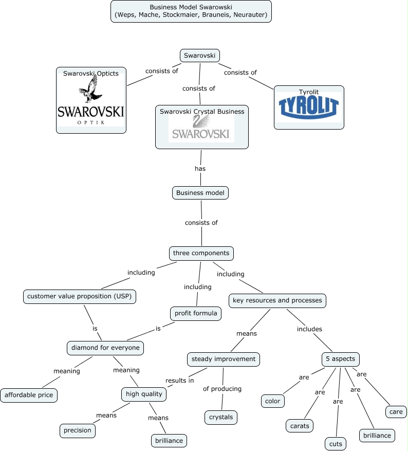 Dieses mit IHMC CmapTools erstellte CMap hat Informationen bezüglich: business model swarovski, profit formula is diamond for everyone, three components including key resources and processes, customer value proposition (USP) is diamond for everyone, key resources and processes includes 5 aspects, high quality means brilliance, Swarovski consists of Swarovski Crystal Business, 5 aspects are color, Business model consists of three components, 5 aspects are carats, steady improvement of producing crystals, key resources and processes means steady improvement, Swarovski consists of Tyrolit, Swarovski Crystal Business has Business model, 5 aspects are cuts, steady improvement results in high quality, diamond for everyone meaning high quality, 5 aspects are brilliance, three components including profit formula, diamond for everyone meaning affordable price, high quality means precision