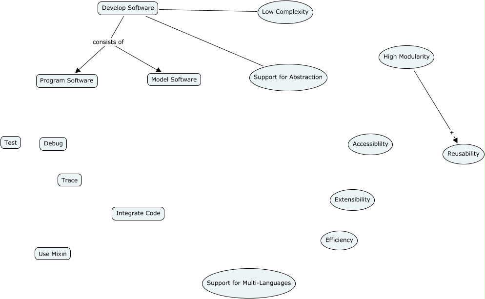 This Concept Map, created with IHMC CmapTools, has information related to: CRUISE, Develop Software consists of Model Software, Develop Software consists of Program Software, Develop Software Support for Abstraction, Develop Software Low Complexity, High Modularity + Reusability