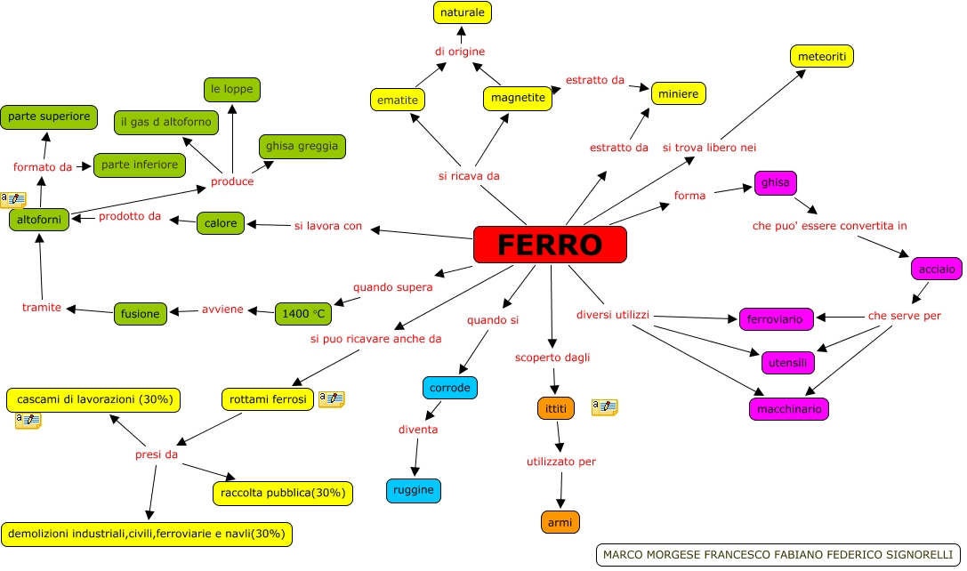 Questa Cmap, creata con IHMC CmapTools, contiene informazioni relative a: Senza titolo, FERRO si trova libero nei meteoriti, rottami ferrosi presi da raccolta pubblica(30%), FERRO si lavora con calore, calore prodotto da altoforni, rottami ferrosi presi da cascami di lavorazioni (30%), altoforni produce il gas d altoforno, altoforni formato da parte inferiore, FERRO diversi utilizzi ferroviario, corrode diventa ruggine, ghisa che puo' essere convertita in acciaio, FERRO scoperto dagli ittiti, ittiti utilizzato per armi, FERRO si ricava da ematite, FERRO diversi utilizzi macchinario, FERRO estratto da miniere, FERRO quando si corrode, magnetite estratto da miniere, 1400 °C avviene fusione, rottami ferrosi presi da demolizioni industriali,civili,ferroviarie e navli(30%), altoforni formato da parte superiore