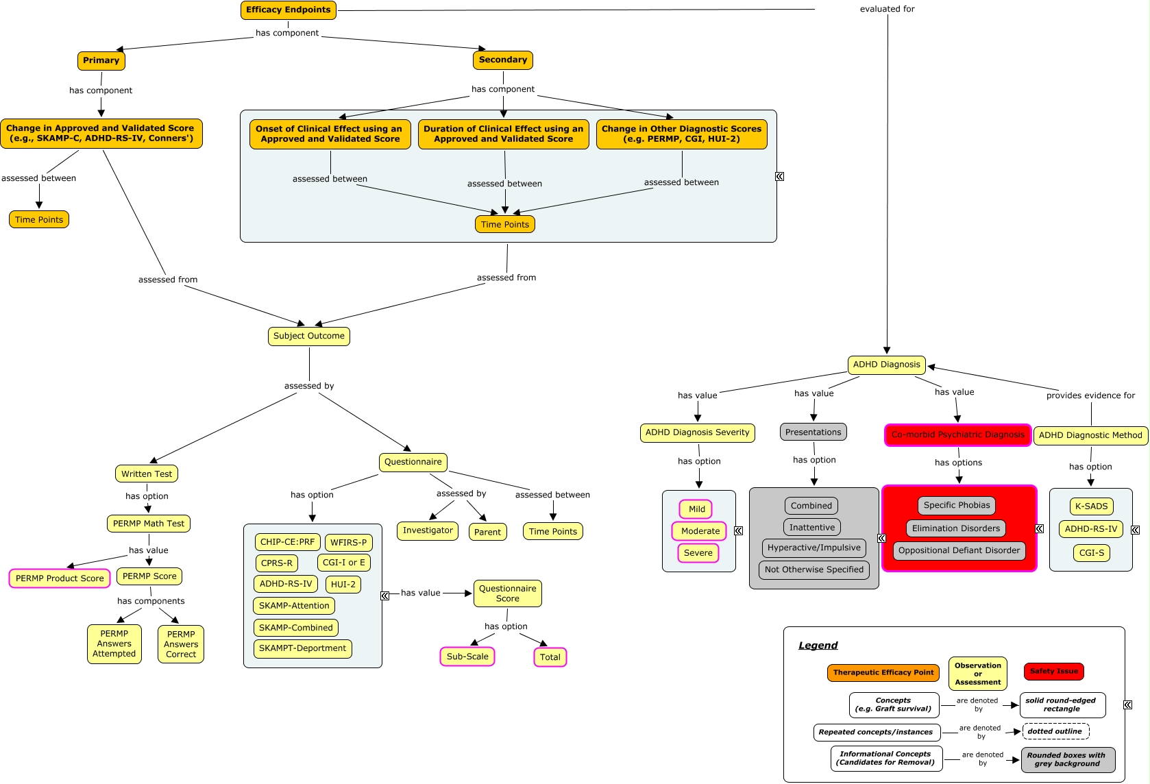 This Concept Map, created with IHMC CmapTools, has information related to: ADHD Efficacy Framework - v4, Questionnaire Score has option Total, Concepts (e.g. Graft survival) are denoted by solid round-edged rectangle, Secondary has component Change in Other Diagnostic Scores (e.g. PERMP, CGI, HUI-2), Onset of Clinical Effect using an Approved and Validated Score assessed between Time Points, ADHD Diagnostic Method has option ????, Presentations has option ????, Questionnaire assessed between Time Points, Change in Approved and Validated Score (e.g., SKAMP-C, ADHD-RS-IV, Conners') assessed between Time Points, PERMP Math Test has value PERMP Score, Questionnaire has option ????, PERMP Score has components PERMP Answers Correct, Questionnaire Score has option Sub-Scale, Change in Approved and Validated Score (e.g., SKAMP-C, ADHD-RS-IV, Conners') assessed from Subject Outcome, ADHD Diagnosis Severity has option ????, ADHD Diagnostic Method provides evidence for ADHD Diagnosis, ADHD Diagnosis has value Presentations, ADHD Diagnosis has value Co-morbid Psychiatric Diagnosis, Subject Outcome assessed by Questionnaire, Efficacy Endpoints has component Secondary, Questionnaire assessed by Parent