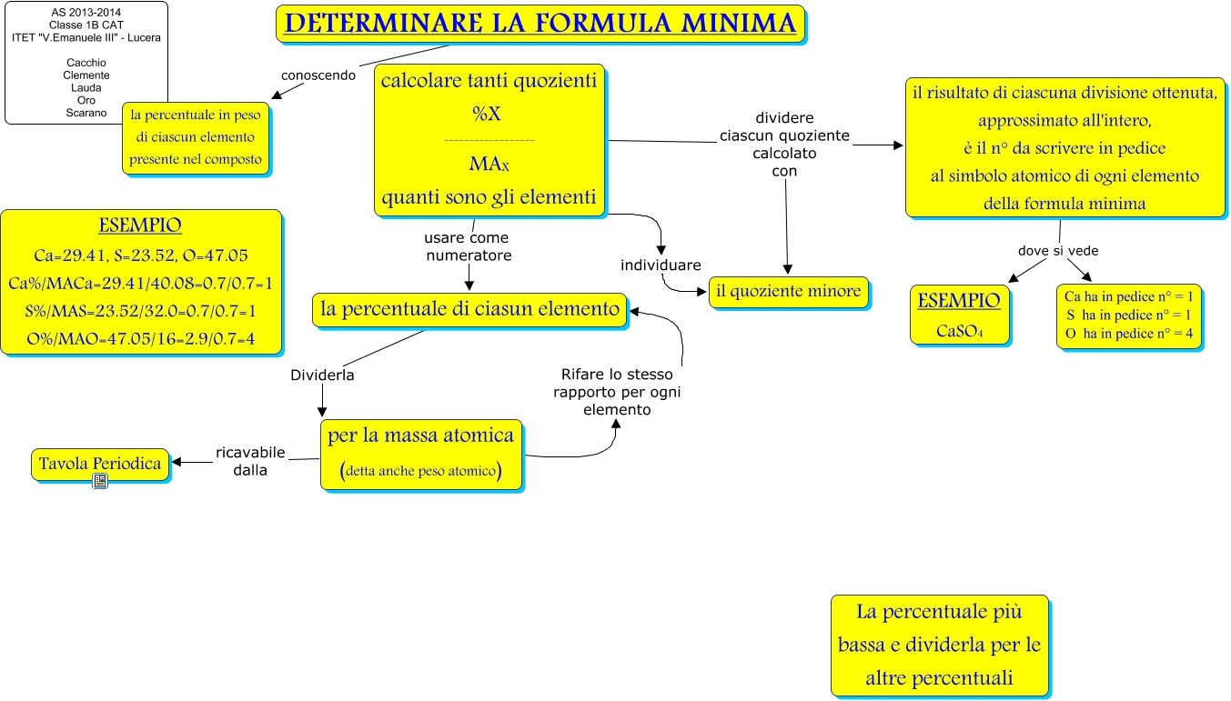 Questa Cmap, creata con IHMC CmapTools, contiene informazioni relative a: Formula minima, per la massa atomica (detta anche peso atomico) ricavabile dalla Tavola Periodica, per la massa atomica (detta anche peso atomico) Rifare lo stesso rapporto per ogni elemento la percentuale di ciasun elemento, DETERMINARE LA FORMULA MINIMA conoscendo la percentuale in peso di ciascun elemento presente nel composto, la percentuale di ciasun elemento Dividerla per la massa atomica (detta anche peso atomico), calcolare tanti quozienti %X ------------------ MAX quanti sono gli elementi usare come numeratore la percentuale di ciasun elemento, calcolare tanti quozienti %X ------------------ MAX quanti sono gli elementi individuare il quoziente minore, calcolare tanti quozienti %X ------------------ MAX quanti sono gli elementi dividere ciascun quoziente calcolato con il quoziente minore, il risultato di ciascuna divisione ottenuta, approssimato all'intero, è il n° da scrivere in pedice al simbolo atomico di ogni elemento della formula minima dove si vede Ca ha in pedice n° = 1 S ha in pedice n° = 1 O ha in pedice n° = 4, calcolare tanti quozienti %X ------------------ MAX quanti sono gli elementi dividere ciascun quoziente calcolato con il risultato di ciascuna divisione ottenuta, approssimato all'intero, è il n° da scrivere in pedice al simbolo atomico di ogni elemento della formula minima, il risultato di ciascuna divisione ottenuta, approssimato all'intero, è il n° da scrivere in pedice al simbolo atomico di ogni elemento della formula minima dove si vede ESEMPIO CaSO4