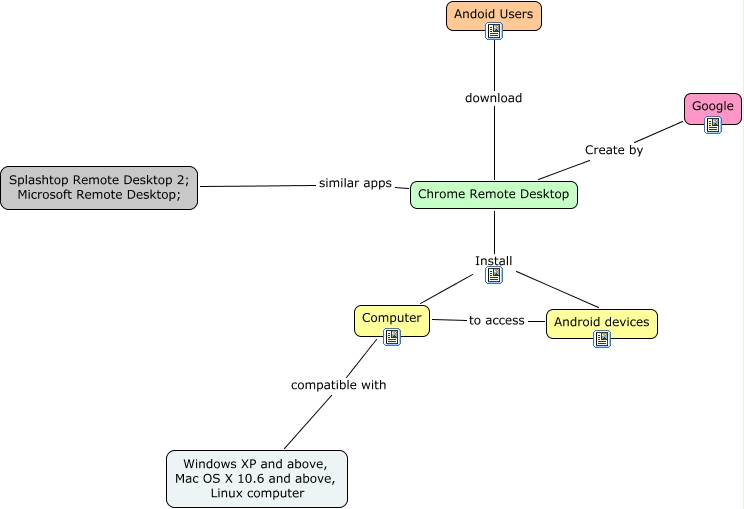 Esse mapa conceitual, produzido no IHMC CmapTools, tem a informação relacionada a: cmap, Chrome Remote Desktop Install Android devices, Chrome Remote Desktop Install Computer, Chrome Remote Desktop similar apps Splashtop Remote Desktop 2; Microsoft Remote Desktop;, Computer compatible with Windows XP and above, Mac OS X 10.6 and above, Linux computer, Computer to access Android devices, Andoid Users download Chrome Remote Desktop, Chrome Remote Desktop Create by Google