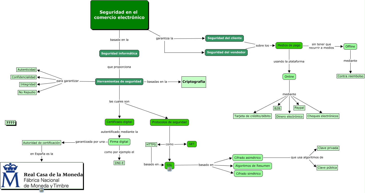 Este Cmap, tiene información relacionada con: SEGComercioElectronico, SSL basado en Cifrado asimétrico, SSL basado en Cifrado simétrico, Certificado digital autentificado mediante la Firma digital, Seguridad en el comercio electrónico garantiza la Seguridad del vendedor, Seguridad informática que proporciona Herramientas de seguridad, Protocolos de seguridad como HTTPS, Protocolos de seguridad como SET, Seguridad del cliente sobre los Medios de pago, Herramientas de seguridad para garantizar Confidencialidad, Offline mediante Contra reembolso, Firma digital garantizada por una Autoridad de certificación, Autoridad de certificación en España es la, Herramientas de seguridad para garantizar Autenticidad, Herramientas de seguridad las cuales son Certificado digital, Protocolos de seguridad como SSL, Firma digital como por ejemplo el DNI-E, Herramientas de seguridad para garantizar No Repudio, HTTPS basado en SSL, Online mediante Dinero electrónico, Medios de pago sin tener que recurrir a medios Offline