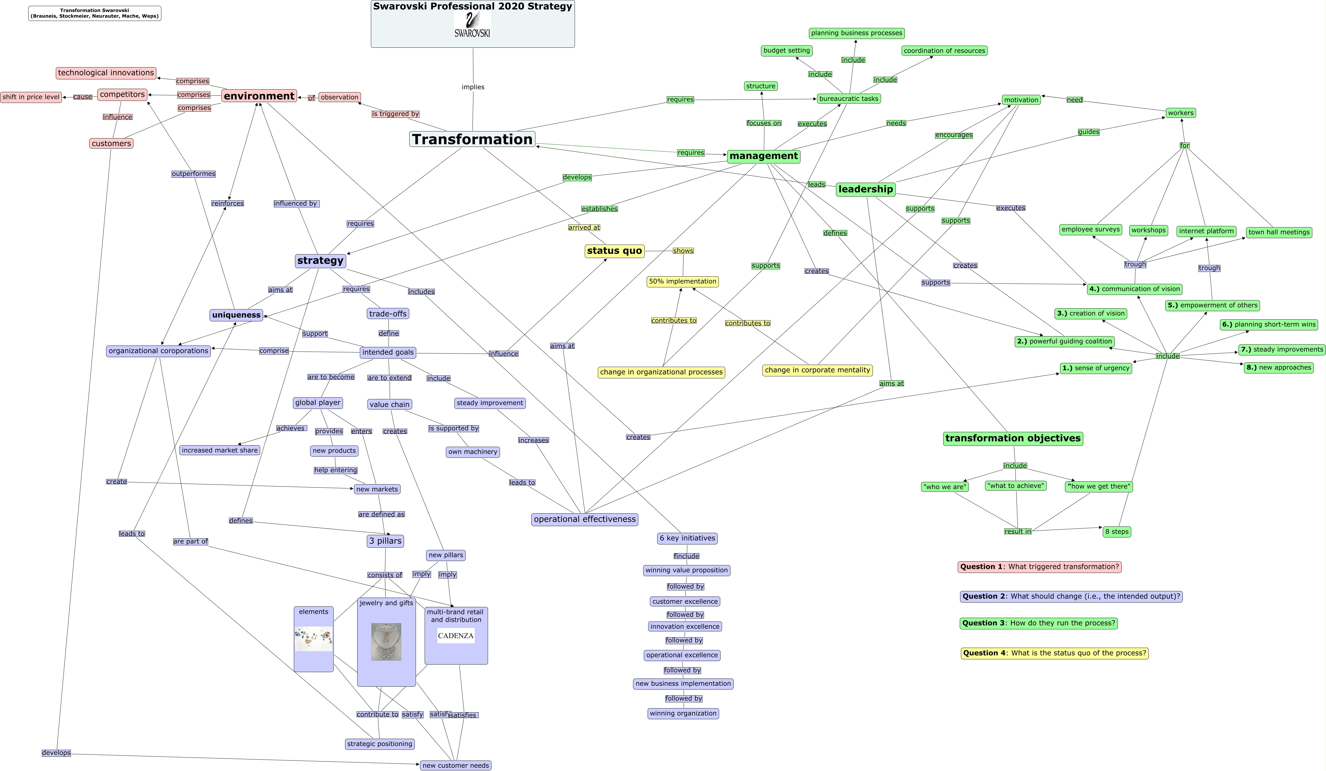 Dieses mit IHMC CmapTools erstellte CMap hat Informationen bezüglich: Swarovski_02_final-map, strategy aims at uniqueness, 6 key initiatives finclude winning value proposition, 8 steps include 2.) powerful guiding coalition, management creates 2.) powerful guiding coalition, environment reinforces organizational coroporations, Transformation requires bureaucratic tasks, intended goals are to become global player, workshops for workers, environment comprises competitors, operational excellence followed by new business implementation, jewelry and gifts satisfy new customer needs, leadership leads Transformation, 4.) communication of vision trough town hall meetings, strategy requires trade-offs, change in corporate mentality contributes to 50% implementation, multi-brand retail and distribution contribute to strategic positioning, intended goals influence status quo, Transformation arrived at status quo, strategy includes 6 key initiatives, "what to achieve" result in 8 steps