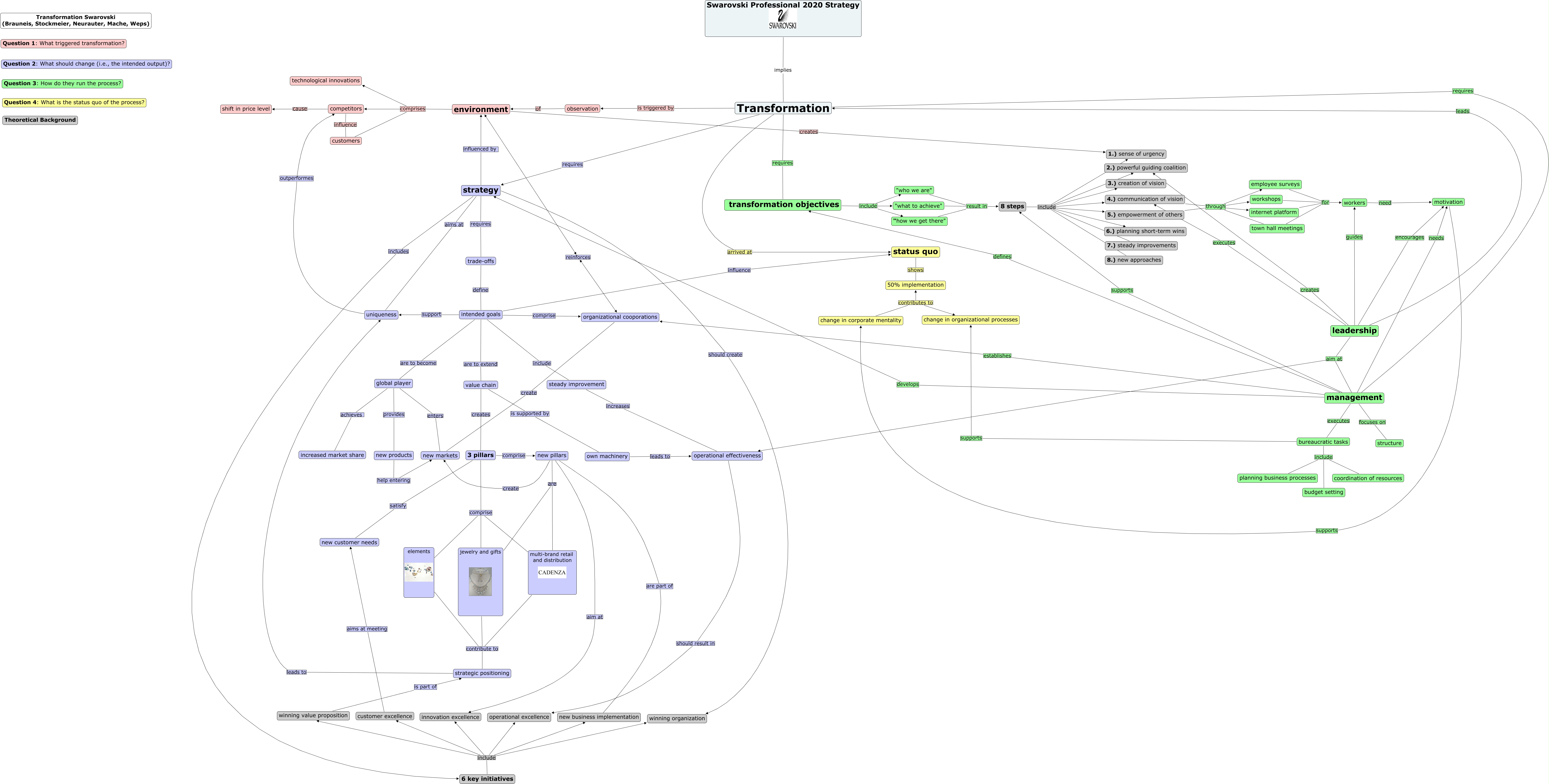 Dieses mit IHMC CmapTools erstellte CMap hat Informationen bezüglich: Swarovski_02_final-map_versuch, environment creates 1.) sense of urgency, Transformation requires transformation objectives, management needs motivation, customer excellence aims at meeting new customer needs, winning value proposition is part of strategic positioning, leadership creates 2.) powerful guiding coalition, intended goals influence status quo, new pillars are multi-brand retail and distribution, 5.) empowerment of others through employee surveys, environment reinforces organizational cooporations, transformation objectives include "who we are", jewelry and gifts contribute to strategic positioning, observation of environment, strategy should create winning organization, town hall meetings for workers, strategy influenced by environment, new pillars are part of new business implementation, environment comprises technological innovations, bureaucratic tasks include budget setting, management develops strategy