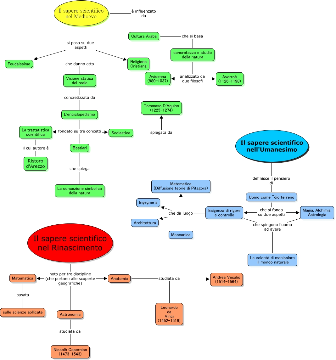 Questa Cmap, creata con IHMC CmapTools, contiene informazioni relative a: Massa_Saperiscientifici, Feudalesimo che danno atto Visione statica del reale, concretezza e studio della natura analizzato da due filosofi Averroè (1126-1198), Il sapere scientifico nel Medioevo si posa su due aspetti Feudalesimo, Scolastica spiegata da Tommaso D'Aquino (1225-1274), Esigenza di rigore e controllo che dà luogo Meccanica, La trattatistica scientifica il cui autore è Ristoro d'Arezzo, Il sapere scientifico nel Medioevo è influenzato da Cultura Araba, Il sapere scientifico nel Rinascimento noto per tre discipline (che portano alle scoperte geografiche) Astronomia, Il sapere scientifico nel Rinascimento noto per tre discipline (che portano alle scoperte geografiche) Anatomia, Il sapere scientifico nell'Umanesimo definisce il pensiero di Uomo come "dio terreno, Uomo come "dio terreno che si fonda su due aspetti Esigenza di rigore e controllo, Matematica basata sulle scienze apllicate, Il sapere scientifico nel Medioevo si posa su due aspetti Religione Cristiana, Anatomia studiata da Leonardo da Vinci (1452-1519), Esigenza di rigore e controllo che dà luogo Ingegneria, Cultura Araba che si basa concretezza e studio della natura, Uomo come "dio terreno che si fonda su due aspetti Magia, Alchimia, Astrologia, concretezza e studio della natura analizzato da due filosofi Avicenna (980-1037), Esigenza di rigore e controllo che dà luogo Matematica (Diffusione teorie di Pitagora), Religione Cristiana che danno atto Visione statica del reale