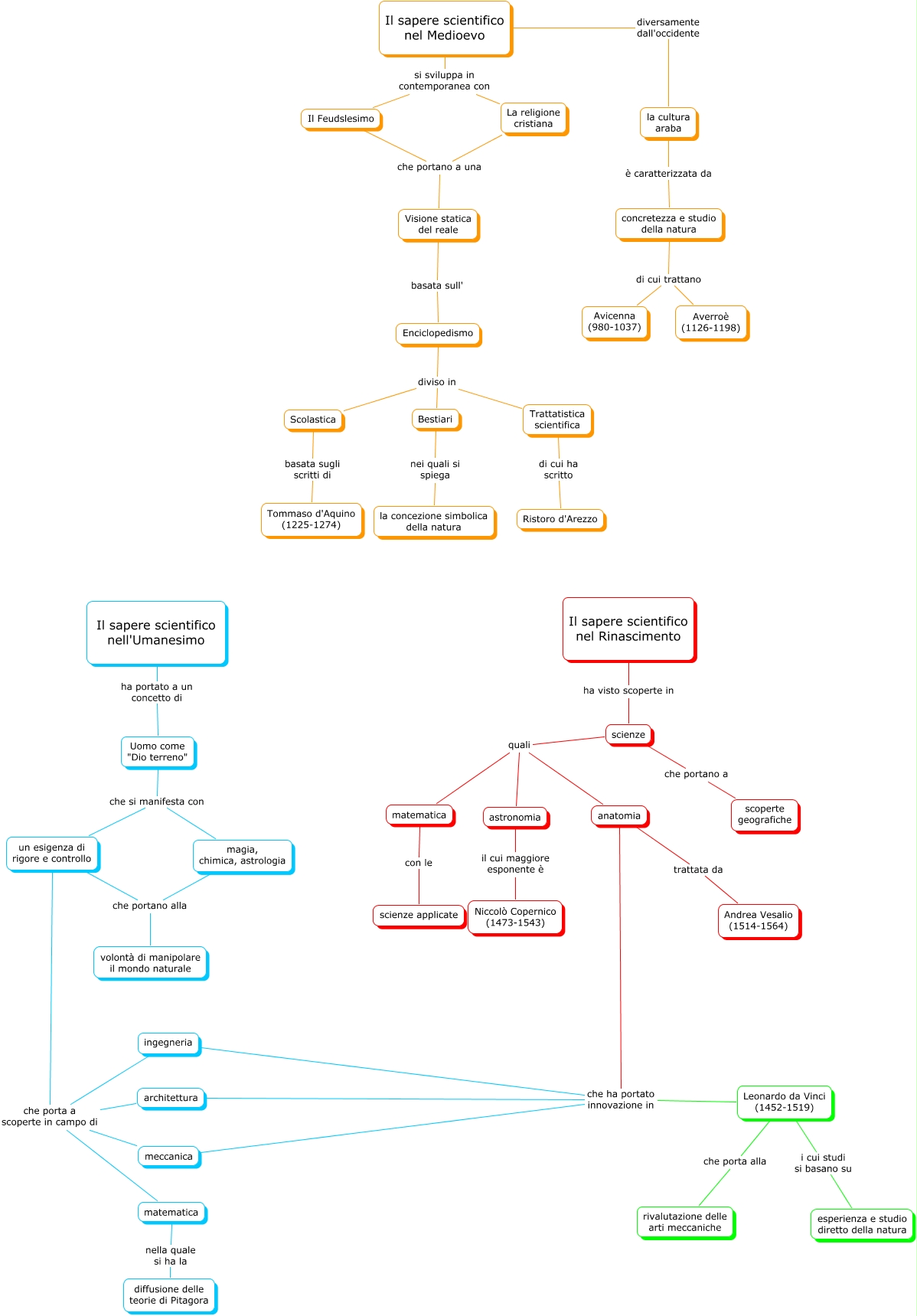 Questa Cmap, creata con IHMC CmapTools, contiene informazioni relative a: Mercanti_Saperi scientifici, astronomia il cui maggiore esponente è Niccolò Copernico (1473-1543), Enciclopedismo diviso in Trattatistica scientifica, la cultura araba è caratterizzata da concretezza e studio della natura, scienze quali astronomia, anatomia trattata da Andrea Vesalio (1514-1564), concretezza e studio della natura di cui trattano Avicenna (980-1037), Bestiari nei quali si spiega la concezione simbolica della natura, Visione statica del reale basata sull' Enciclopedismo, Il sapere scientifico nell'Umanesimo ha portato a un concetto di Uomo come "Dio terreno", Il sapere scientifico nel Medioevo si sviluppa in contemporanea con Il Feudslesimo, Enciclopedismo diviso in Bestiari, concretezza e studio della natura di cui trattano Averroè (1126-1198), un esigenza di rigore e controllo che porta a scoperte in campo di meccanica, un esigenza di rigore e controllo che porta a scoperte in campo di architettura, anatomia che ha portato innovazione in Leonardo da Vinci (1452-1519), Il sapere scientifico nel Rinascimento ha visto scoperte in scienze, Uomo come "Dio terreno" che si manifesta con un esigenza di rigore e controllo, magia, chimica, astrologia che portano alla volontà di manipolare il mondo naturale, Il sapere scientifico nel Medioevo diversamente dall'occidente la cultura araba, anatomia che ha portato innovazione in ingegneria