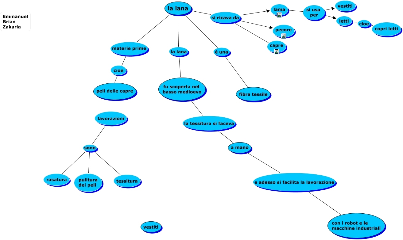 Este Cmap, tiene información relacionada con: Mappa lana.cmap 2, la lana è una fibra tessile, fu scoperta nel basso medioevo la tessitura si faceva a mano, la lana materie prime peli delle capre, lavorazioni sono tessitura, a mano e adesso si facilita la lavorazione con i robot e le macchine industriali, lama si usa per letti, lavorazioni sono pulitura dei peli, la lana si ricava da lama, la lana la lana fu scoperta nel basso medioevo, la lana si ricava da pecore, la lana si ricava da capre, lama si usa per vestiti, lavorazioni sono rasatura, letti cioe copri letti