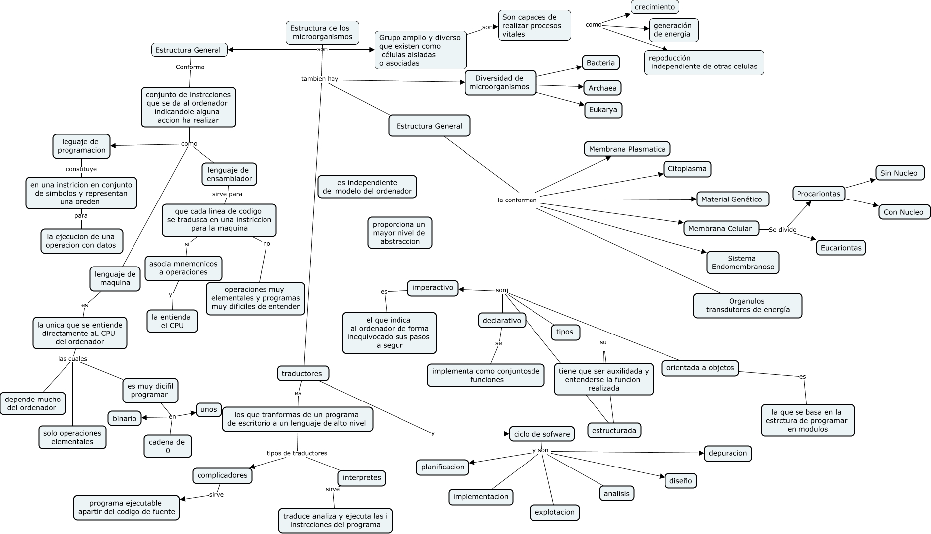 Este Cmap, tiene información relacionada con: Mapa 2 26, interpretes sirve traduce analiza y ejecuta las i instrcciones del programa, traductores es los que tranformas de un programa de escritorio a un lenguaje de alto nivel, ciclo de sofware y son analisis, los que tranformas de un programa de escritorio a un lenguaje de alto nivel tipos de traductores complicadores, Grupo amplio y diverso que existen como células aisladas o asociadas son Son capaces de realizar procesos vitales, la unica que se entiende directamente aL CPU del ordenador las cuales es muy dicifil programar, asocia mnemonicos a operaciones y la entienda el CPU, la unica que se entiende directamente aL CPU del ordenador las cuales depende mucho del ordenador, ciclo de sofware y son explotacion, lenguaje de maquina es la unica que se entiende directamente aL CPU del ordenador, estructurada su tiene que ser auxilidada y entenderse la funcion realizada, es muy dicifil programar en cadena de 0, tipos sonj orientada a objetos, Estructura de los microorganismos son Estructura General, los que tranformas de un programa de escritorio a un lenguaje de alto nivel tipos de traductores interpretes, orientada a objetos es la que se basa en la estrctura de programar en modulos, Procariontas ???? Con Nucleo, Estructura de los microorganismos tambien hay Diversidad de microorganismos, Estructura de los microorganismos son Grupo amplio y diverso que existen como células aisladas o asociadas, ciclo de sofware y son depuracion