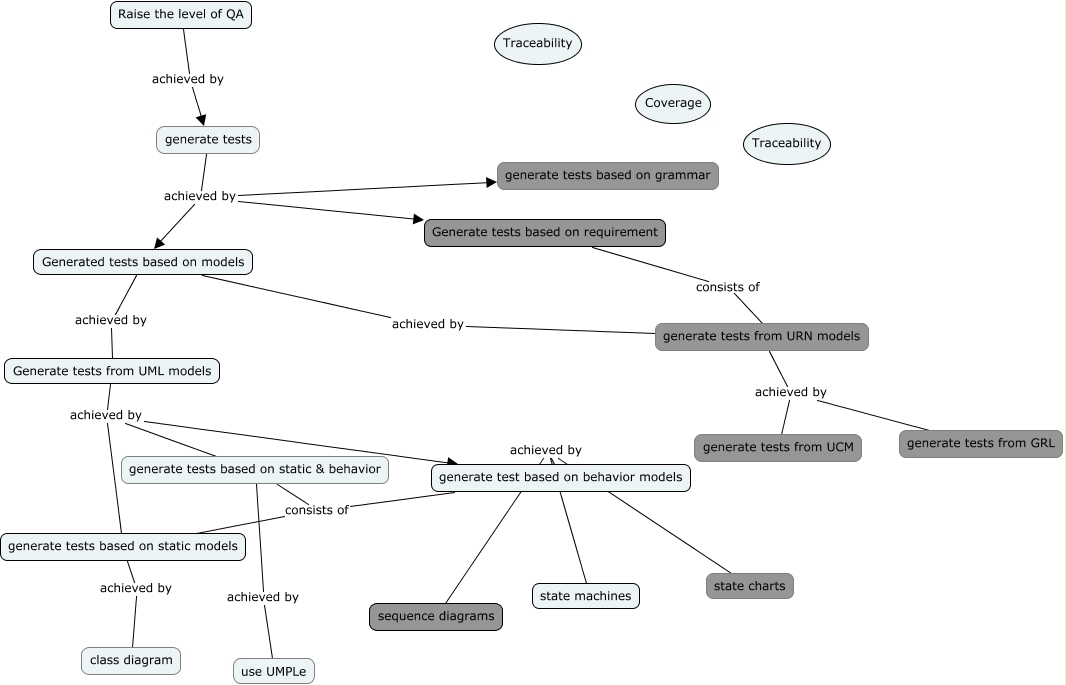 This Concept Map, created with IHMC CmapTools, has information related to: modelbasedTesting_inUmple, generate tests based on static & behavior achieved by use UMPLe, generate tests achieved by Generated tests based on models, generate test based on behavior models achieved by state machines, generate test based on behavior models achieved by state charts, generate test based on behavior models achieved by sequence diagrams, Generate tests from UML models achieved by generate test based on behavior models, generate tests achieved by Generate tests based on requirement, generate tests from URN models consists of Generate tests based on requirement, generate tests achieved by generate tests based on grammar, generate tests based on static models achieved by class diagram, Generated tests based on models achieved by generate tests from URN models, Generated tests based on models achieved by Generate tests from UML models, generate tests based on static & behavior consists of generate test based on behavior models, generate tests from URN models achieved by generate tests from GRL, generate tests from URN models achieved by generate tests from UCM, generate tests based on static & behavior consists of generate tests based on static models, Generate tests from UML models achieved by generate tests based on static models, Raise the level of QA achieved by generate tests, Generate tests from UML models achieved by generate tests based on static & behavior