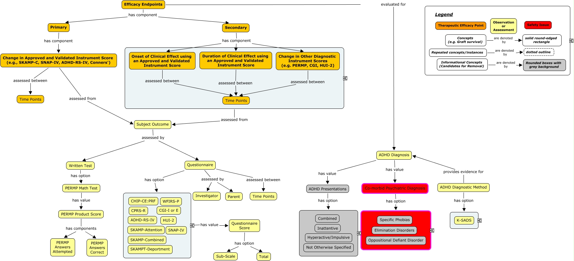 This Concept Map, created with IHMC CmapTools, has information related to: ADHD Efficacy Framework - v5, Questionnaire Score has option Total, Concepts (e.g. Graft survival) are denoted by solid round-edged rectangle, Secondary has component Change in Other Diagnostic Instrument Scores (e.g. PERMP, CGI, HUI-2), Onset of Clinical Effect using an Approved and Validated Instrument Score assessed between Time Points, ADHD Diagnostic Method has option ????, ADHD Presentations has option ????, Questionnaire assessed between Time Points, PERMP Product Score has components PERMP Answers Attempted, Change in Approved and Validated Instrument Score (e.g., SKAMP-C, SNAP-IV, ADHD-RS-IV, Conners') assessed between Time Points, Questionnaire has option ????, Questionnaire Score has option Sub-Scale, Change in Approved and Validated Instrument Score (e.g., SKAMP-C, SNAP-IV, ADHD-RS-IV, Conners') assessed from Subject Outcome, ???? assessed from Subject Outcome, ADHD Diagnostic Method provides evidence for ADHD Diagnosis, ADHD Diagnosis has value ADHD Presentations, ADHD Diagnosis has value Co-morbid Psychiatric Diagnosis, Subject Outcome assessed by Questionnaire, Efficacy Endpoints has component Secondary, Questionnaire assessed by Parent, Secondary has component Onset of Clinical Effect using an Approved and Validated Instrument Score