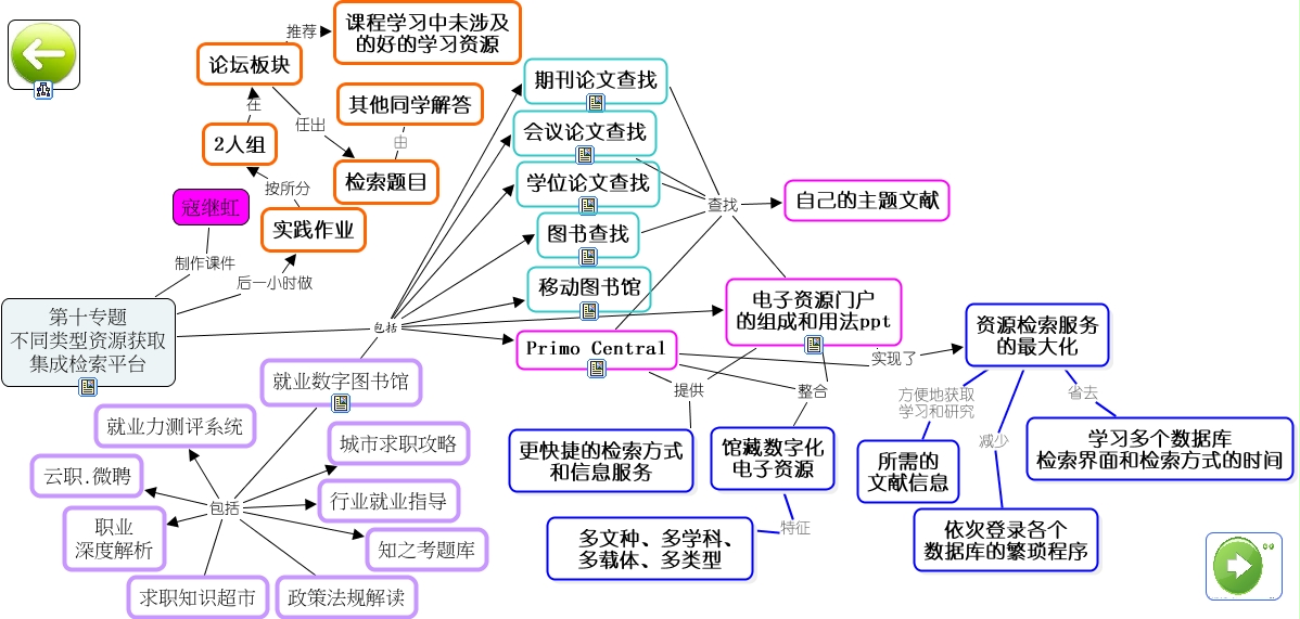 此概念图以 IHMC CmapTools 创建, 内含信息有关于: 第十三专题 图书馆资料获取2012信管, 就业数字图书馆 包括 云职.微聘, 资源检索服务 的最大化 方便地获取 学习和研究 所需的 文献信息, 寇继虹 制作课件 第十专题 不同类型资源获取 集成检索平台, 第十专题 不同类型资源获取 集成检索平台 包括 期刊论文查找, 电子资源门户 的组成和用法ppt 查找 自己的主题文献, 就业数字图书馆 包括 求职知识超市, 图书查找 查找 自己的主题文献, 2人组 在 论坛板块, 检索题目 由 其他同学解答, 第十专题 不同类型资源获取 集成检索平台 后一小时做 实践作业, 就业数字图书馆 包括 知之考题库, 会议论文查找 查找 自己的主题文献, 学位论文查找 查找 自己的主题文献, Primo Central 查找 自己的主题文献, 就业数字图书馆 包括 城市求职攻略, 就业数字图书馆 包括 行业就业指导, 资源检索服务 的最大化 减少 依次登录各个 数据库的繁琐程序, Primo Central 实现了 资源检索服务 的最大化, 电子资源门户 的组成和用法ppt 整合 馆藏数字化 电子资源, 馆藏数字化 电子资源 特征 多文种、多学科、 多载体、多类型