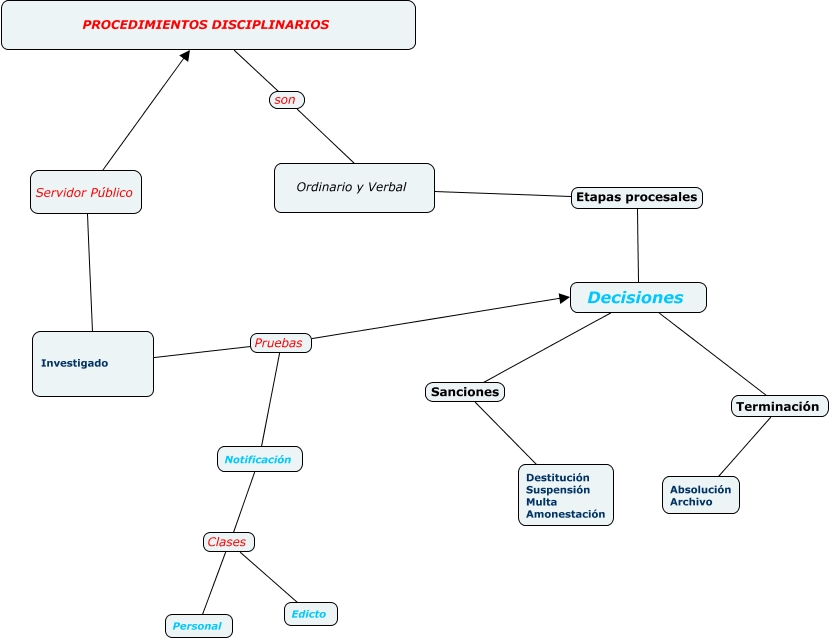 Este Cmap, tiene información relacionada con: EDGAR, Notificación Clases Personal, PROCEDIMIENTOS DISCIPLINARIOS son Ordinario y Verbal, Ordinario y Verbal Etapas procesales Decisiones, Investigado Pruebas Decisiones, Decisiones Sanciones Destitución Suspensión Multa Amonestación, Notificación Clases Edicto, Investigado Servidor Público PROCEDIMIENTOS DISCIPLINARIOS, Investigado Pruebas Notificación, Decisiones Terminación Absolución Archivo