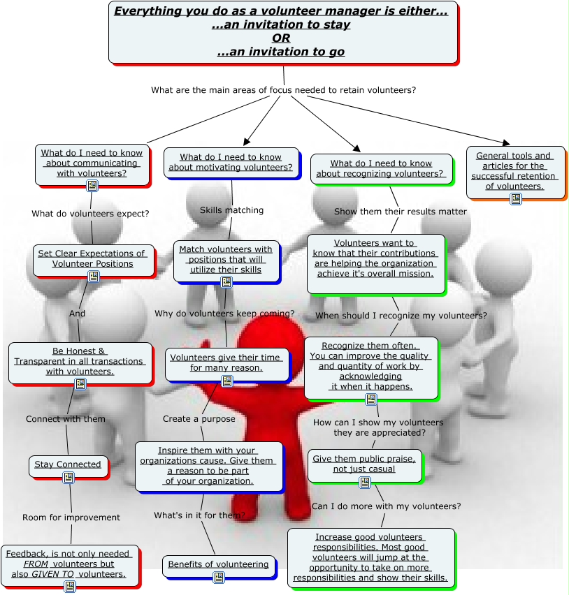This Concept Map, created with IHMC CmapTools, has information related to: Retaining Volunteers, Everything you do as a volunteer manager is either... ...an invitation to stay OR ...an invitation to go What are the main areas of focus needed to retain volunteers? What do I need to know about communicating with volunteers?, Stay Connected Room for improvement Feedback, is not only needed FROM volunteers but also GIVEN TO volunteers., Set Clear Expectations of Volunteer Positions And Be Honest & Transparent in all transactions with volunteers., Give them public praise, not just casual Can I do more with my volunteers? Increase good volunteers responsibilities. Most good volunteers will jump at the opportunity to take on more responsibilities and show their skills., Recognize them often. You can improve the quality and quantity of work by acknowledging it when it happens. How can I show my volunteers they are appreciated? Give them public praise, not just casual, What do I need to know about communicating with volunteers? What do volunteers expect? Set Clear Expectations of Volunteer Positions, Match volunteers with positions that will utilize their skills Why do volunteers keep coming? Volunteers give their time for many reason., Volunteers give their time for many reason. Create a purpose Inspire them with your organizations cause. Give them a reason to be part of your organization., Volunteers want to know that their contributions are helping the organization achieve it's overall mission. When should I recognize my volunteers? Recognize them often. You can improve the quality and quantity of work by acknowledging it when it happens., What do I need to know about recognizing volunteers? Show them their results matter Volunteers want to know that their contributions are helping the organization achieve it's overall mission., Be Honest & Transparent in all transactions with volunteers. Connect with them Stay Connected, Everything you do as a volunteer manager is either... ...an invitation to stay OR ...an invitation to go What are the main areas of focus needed to retain volunteers? What do I need to know about recognizing volunteers?, Everything you do as a volunteer manager is either... ...an invitation to stay OR ...an invitation to go What are the main areas of focus needed to retain volunteers? General tools and articles for the successful retention of volunteers., Inspire them with your organizations cause. Give them a reason to be part of your organization. What's in it for them? Benefits of volunteering, Everything you do as a volunteer manager is either... ...an invitation to stay OR ...an invitation to go What are the main areas of focus needed to retain volunteers? What do I need to know about motivating volunteers?, What do I need to know about motivating volunteers? Skills matching Match volunteers with positions that will utilize their skills