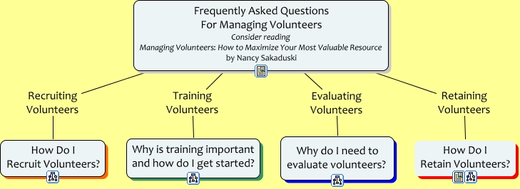 This Concept Map, created with IHMC CmapTools, has information related to: Untitled, Frequently Asked Questions For Managing Volunteers Consider reading Managing Volunteers: How to Maximize Your Most Valuable Resource by Nancy Sakaduski Recruiting Volunteers How Do I Recruit Volunteers?, Frequently Asked Questions For Managing Volunteers Consider reading Managing Volunteers: How to Maximize Your Most Valuable Resource by Nancy Sakaduski Retaining Volunteers How Do I Retain Volunteers?, Frequently Asked Questions For Managing Volunteers Consider reading Managing Volunteers: How to Maximize Your Most Valuable Resource by Nancy Sakaduski Training Volunteers Why is training important and how do I get started?, Frequently Asked Questions For Managing Volunteers Consider reading Managing Volunteers: How to Maximize Your Most Valuable Resource by Nancy Sakaduski Evaluating Volunteers Why do I need to evaluate volunteers?
