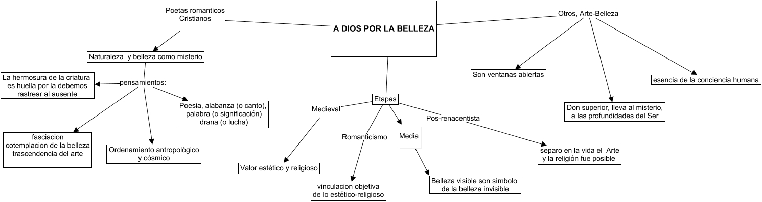 Este Cmap, tiene información relacionada con: LIDIMARI(F), A DIOS POR LA BELLEZA Poetas romanticos Cristianos Naturaleza y belleza como misterio, Naturaleza y belleza como misterio pensamientos: Poesia, alabanza (o canto), palabra (o significación) drana (o lucha), A DIOS POR LA BELLEZA Otros, Arte-Belleza Son ventanas abiertas, Naturaleza y belleza como misterio pensamientos: Ordenamiento antropológico y cósmico, Naturaleza y belleza como misterio pensamientos: fasciacion cotemplacion de la belleza trascendencia del arte, Naturaleza y belleza como misterio pensamientos: La hermosura de la criatura es huella por la debemos rastrear al ausente, Etapas Medieval Valor estético y religioso, Etapas Pos-renacentista separo en la vida el Arte y la religión fue posible, Etapas Media Belleza visible son símbolo de la belleza invisible, Etapas Romanticismo vinculacion objetiva de lo estético-religioso, A DIOS POR LA BELLEZA Otros, Arte-Belleza Don superior, lleva al misterio, a las profundidades del Ser, A DIOS POR LA BELLEZA Otros, Arte-Belleza esencia de la conciencia humana, Etapas ???? ????