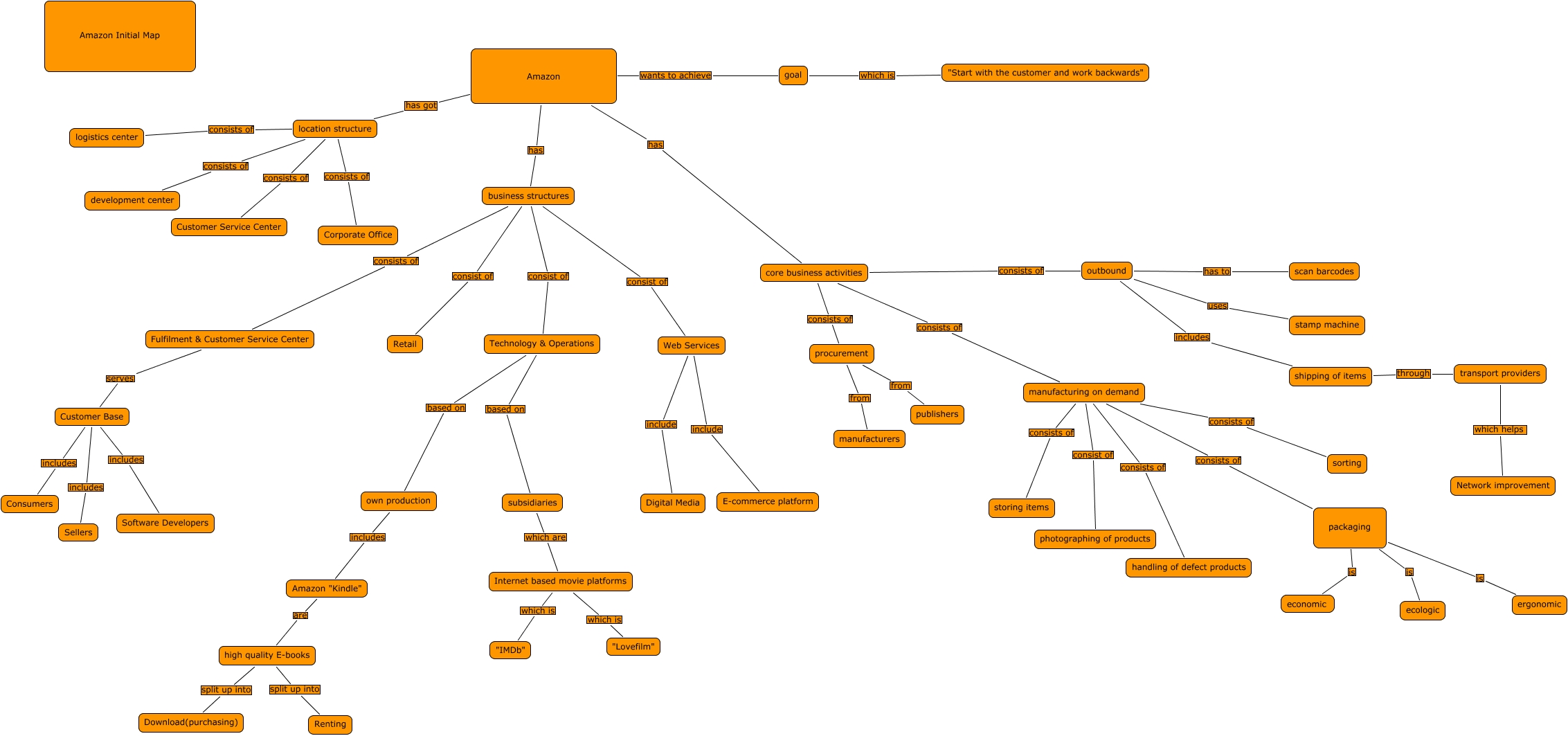Dieses mit IHMC CmapTools erstellte CMap hat Informationen bezüglich: initial Amazon, core business activities consists of procurement, packaging is ecologic, business structures consist of Technology & Operations, manufacturing on demand consists of packaging, manufacturing on demand consists of sorting, manufacturing on demand consist of photographing of products, Internet based movie platforms which is "IMDb", location structure consists of Corporate Office, procurement from manufacturers, Technology & Operations based on subsidiaries, procurement from publishers, Internet based movie platforms which is "Lovefilm", business structures consist of Retail, Web Services include E-commerce platform, manufacturing on demand consists of storing items, Fulfilment & Customer Service Center serves Customer Base, high quality E-books split up into Renting, Customer Base includes Sellers, location structure consists of Customer Service Center, high quality E-books split up into Download(purchasing)