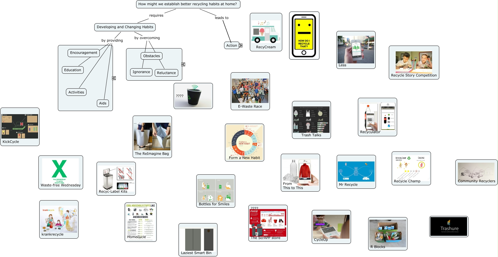 This Concept Map, created with IHMC CmapTools, has information related to: Rercycling Shortlist Refinement, How might we establish better recycling habits at home? leads to Re-Use, Developing and Changing Habits by overcoming Reluctance, How might we establish better recycling habits at home? requires Developing and Changing Habits, Developing and Changing Habits by providing Aids, Developing and Changing Habits by overcoming Ignorance, Developing and Changing Habits by providing Education, Developing and Changing Habits by providing Activities, How might we establish better recycling habits at home? leads to Recycling, How might we establish better recycling habits at home? leads to Reduction
