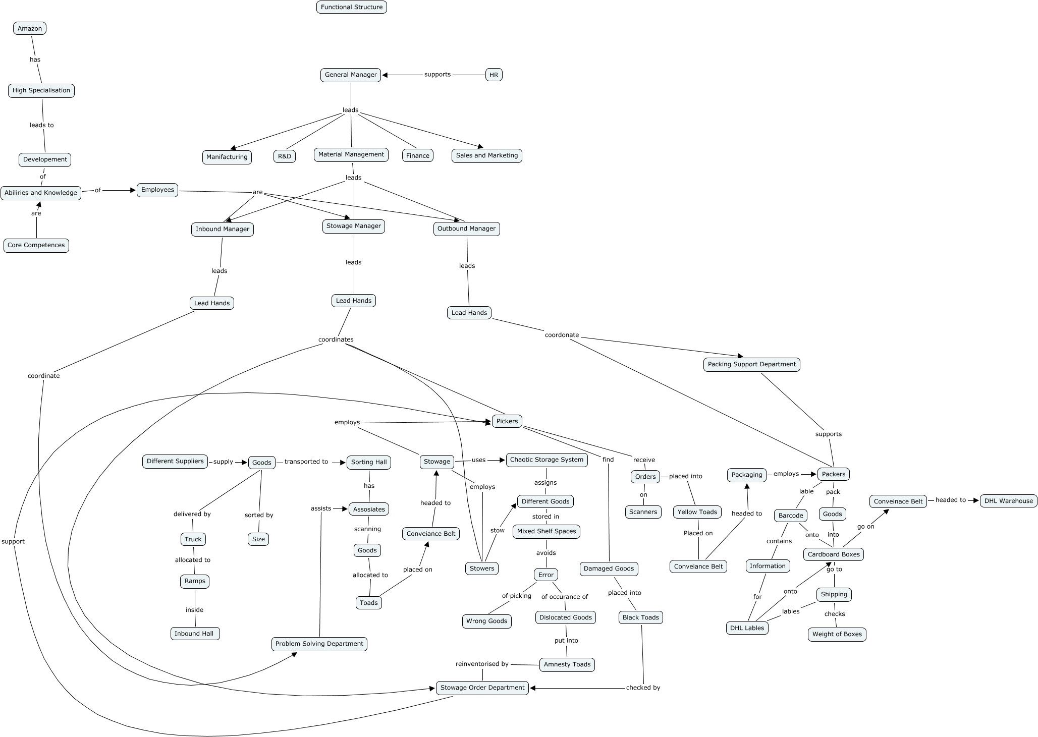 Dieses mit IHMC CmapTools erstellte CMap hat Informationen bezüglich: Amazon 3, Goods sorted by Size, General Manager leads Finance, Goods delivered by Truck, Lead Hands coordinates Stowers, Lead Hands coordinate Problem Solving Department, Packing Support Department supports Packers, Stowage uses Chaotic Storage System, General Manager leads Sales and Marketing, Developement of Abiliries and Knowledge, Damaged Goods placed into Black Toads, Lead Hands coordinates Stowage Order Department, Packers lable Barcode, Packers pack Goods, Stowage Order Department support Pickers, Error of occurance of Dislocated Goods, Material Management leads Inbound Manager, Employees are Stowage Manager, Outbound Manager leads Lead Hands, Material Management leads Outbound Manager, Ramps inside Inbound Hall