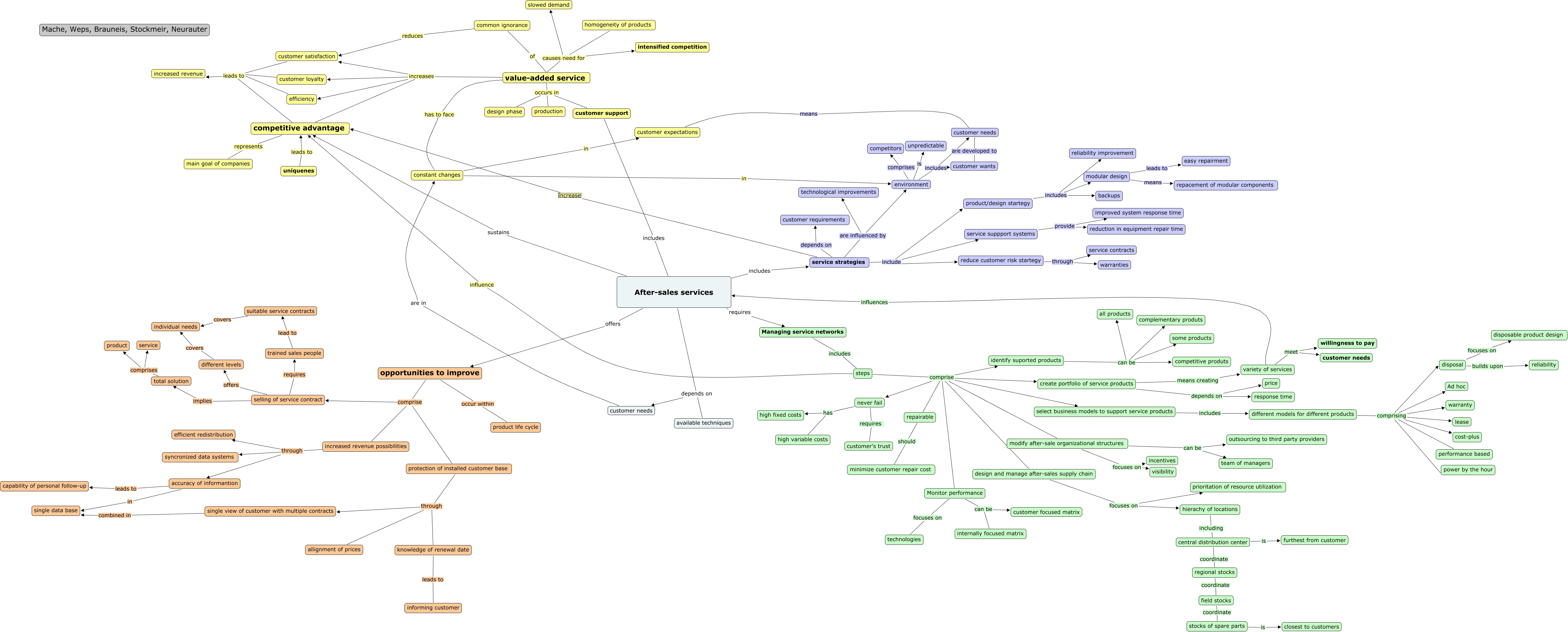 Dieses mit IHMC CmapTools erstellte CMap hat Informationen bezüglich: after service theory, uniquenes leads to competitive advantage, different models for different products comprising performance based, steps influence competitive advantage, never fail has high variable costs, efficiency leads to increased revenue, repairable should minimize customer repair cost, single view of customer with multiple contracts combined in single data base, environment comprises competitors, different models for different products comprising lease, product/design startegy includes modular design, service strategies are influenced by environment, Managing service networks includes steps, homogeneity of products causes need for slowed demand, service strategies include product/design startegy, Monitor performance can be internally focused matrix, After-sales services depends on available techniques, variety of services meet customer needs, identify suported products can be some products, customer expectations means customer needs, disposal builds upon reliability