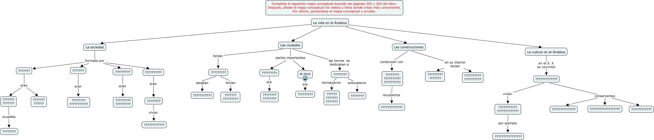 Este Cmap, tiene información relacionada con: La vida en al-Ándalus completar, Las ciudades partes importantes el zoco, ???????? vivían ????????????, Las ciudades las tierras se dedicaban a ????????, La cultura en al-Ándalus en el S. X se convirtió ?????????????, La sociedad formada por ?????????, La vida en al-Ándalus Las construcciones, ????????? estaban ???????????, ????????? tenían ??????? ?????????, ???????? extendieron ????????, ??????? eran ???????? ???????????, La sociedad formada por ??????????, ????????? era ???????? ????????, Las ciudades tenían ?????????, La vida en al-Ándalus La cultura en al-Ándalus, ??????? eran ??????? ???????, La sociedad formada por ???????, ???????? ?????????? ?????????? recubiertos ?????????????, Las construcciones construian con ???????? ?????????? ??????????, ????????????? conservamos ??????????????????, el zoco era ?????????