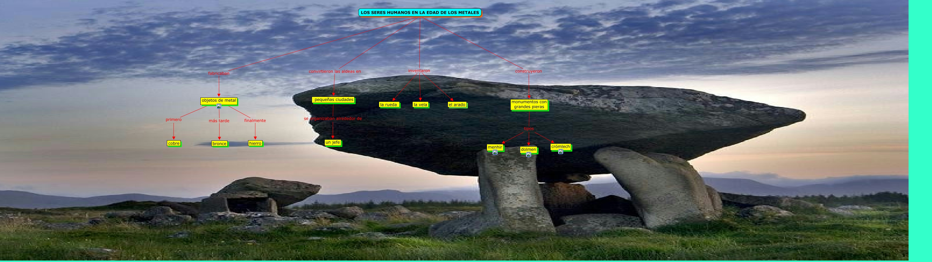 Este Cmap, tiene información relacionada con: Los seres humanos en la Edad de los Metales M, monumentos con grandes pieras tipos menhir, LOS SERES HUMANOS EN LA EDAD DE LOS METALES inventaron el arado, LOS SERES HUMANOS EN LA EDAD DE LOS METALES construyeron monumentos con grandes pieras, LOS SERES HUMANOS EN LA EDAD DE LOS METALES inventaron la rueda, objetos de metal primero cobre, objetos de metal finalmente hierro, LOS SERES HUMANOS EN LA EDAD DE LOS METALES fabricaban objetos de metal, LOS SERES HUMANOS EN LA EDAD DE LOS METALES inventaron la vela, monumentos con grandes pieras tipos crómlech, monumentos con grandes pieras tipos dolmen, objetos de metal más tarde bronce, LOS SERES HUMANOS EN LA EDAD DE LOS METALES convirtieron las aldeas en pequeñas ciudades, pequeñas ciudades se organizaban alrededor de un jefe