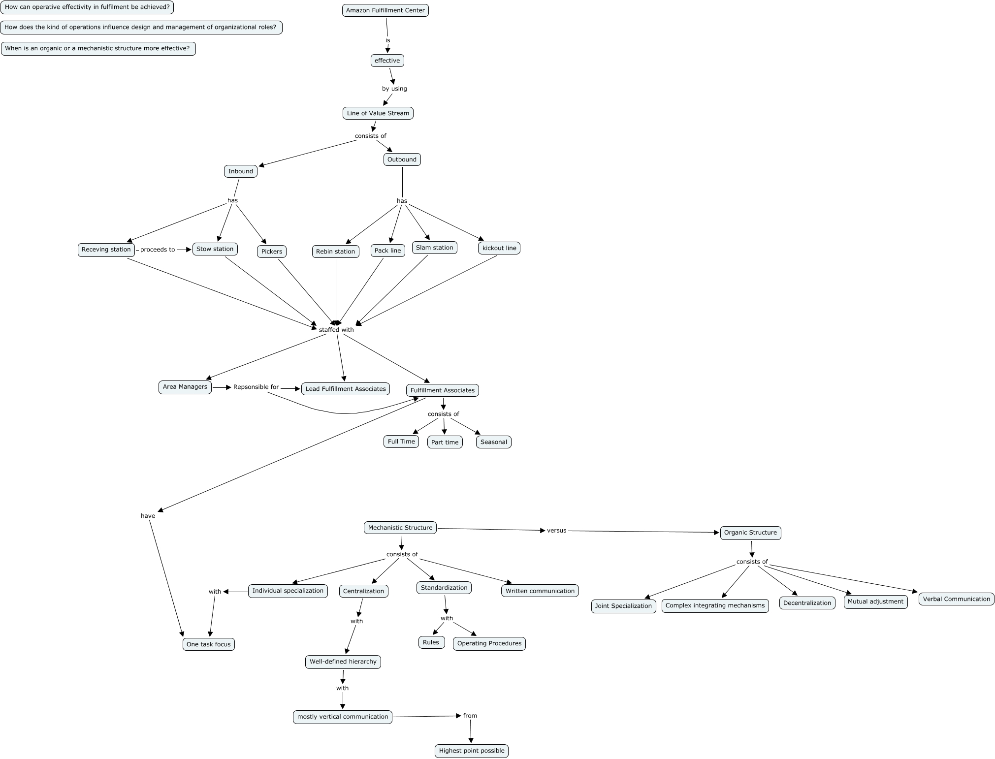 This Concept Map, created with IHMC CmapTools, has information related to: Initial_Map_Amazon, Organic Structure consists of Complex integrating mechanisms, Well-defined hierarchy with mostly vertical communication, Fulfillment Associates consists of Seasonal, Pickers staffed with Lead Fulfillment Associates, Outbound has Pack line, Receving station staffed with Fulfillment Associates, kickout line staffed with Fulfillment Associates, Outbound has kickout line, Area Managers Repsonsible for Fulfillment Associates, Slam station staffed with Area Managers, Mechanistic Structure consists of Individual specialization, Mechanistic Structure consists of Standardization, effective by using Line of Value Stream, Organic Structure consists of Decentralization, Pickers staffed with Fulfillment Associates, Individual specialization with One task focus, Stow station staffed with Area Managers, Organic Structure consists of Joint Specialization, Mechanistic Structure consists of Centralization, Stow station staffed with Fulfillment Associates