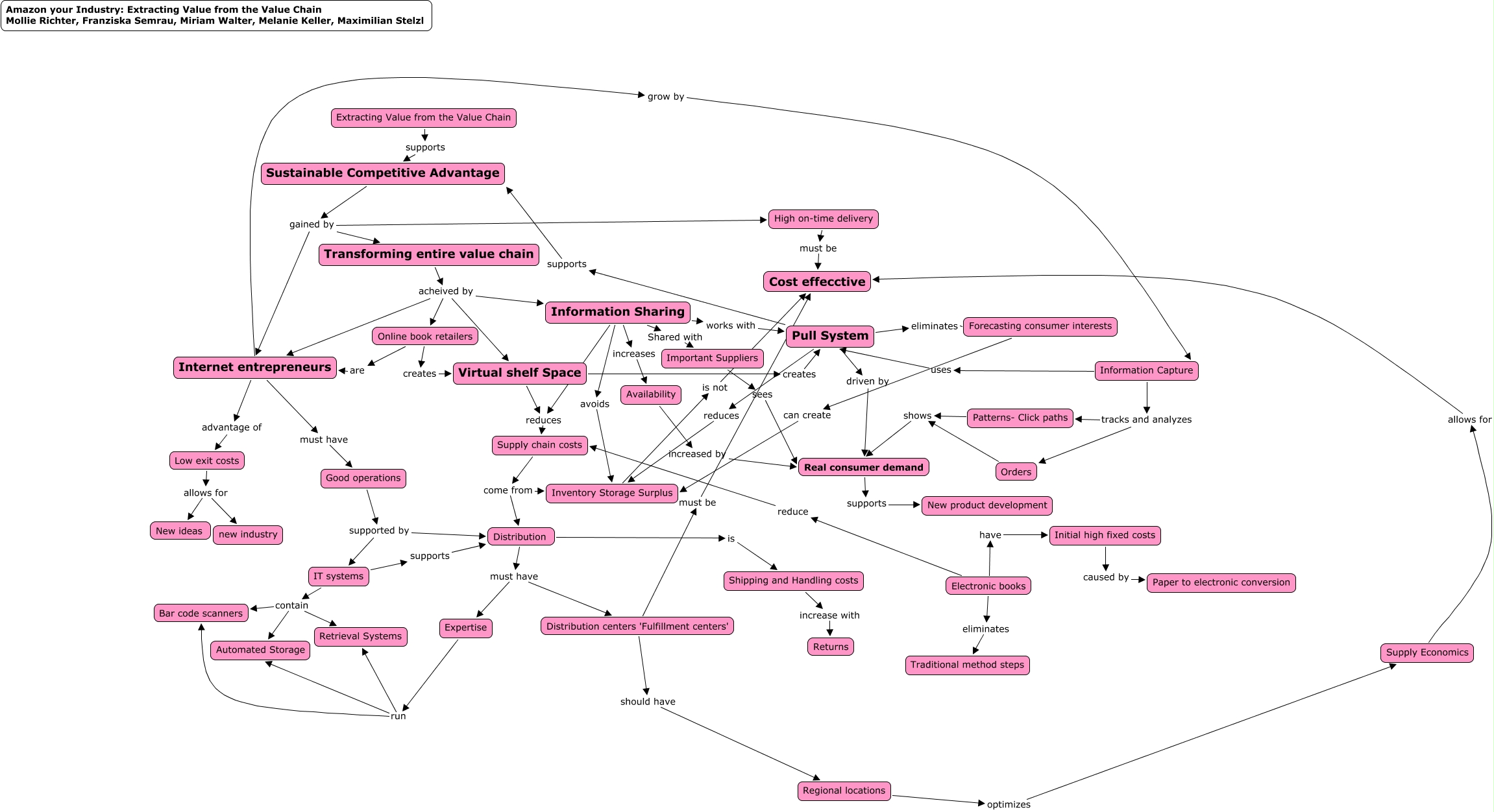 This Concept Map, created with IHMC CmapTools, has information related to: Theory_Map_Amazon_2, Online book retailers creates Virtual shelf Space, Regional locations optimizes Supply Economics, Electronic books eliminates Traditional method steps, Transforming entire value chain acheived by Information Sharing, Internet entrepreneurs grow by Information Capture, Expertise run Automated Storage, Pull System supports Sustainable Competitive Advantage, Sustainable Competitive Advantage gained by Internet entrepreneurs, Virtual shelf Space creates Pull System, Distribution is Shipping and Handling costs, Good operations supported by Distribution, Virtual shelf Space reduces Supply chain costs, Transforming entire value chain acheived by Virtual shelf Space, Orders shows Real consumer demand, Expertise run Bar code scanners, Internet entrepreneurs advantage of Low exit costs, Distribution must have Distribution centers 'Fulfillment centers', Good operations supported by IT systems, IT systems contain Retrieval Systems, Supply Economics allows for Cost effecctive