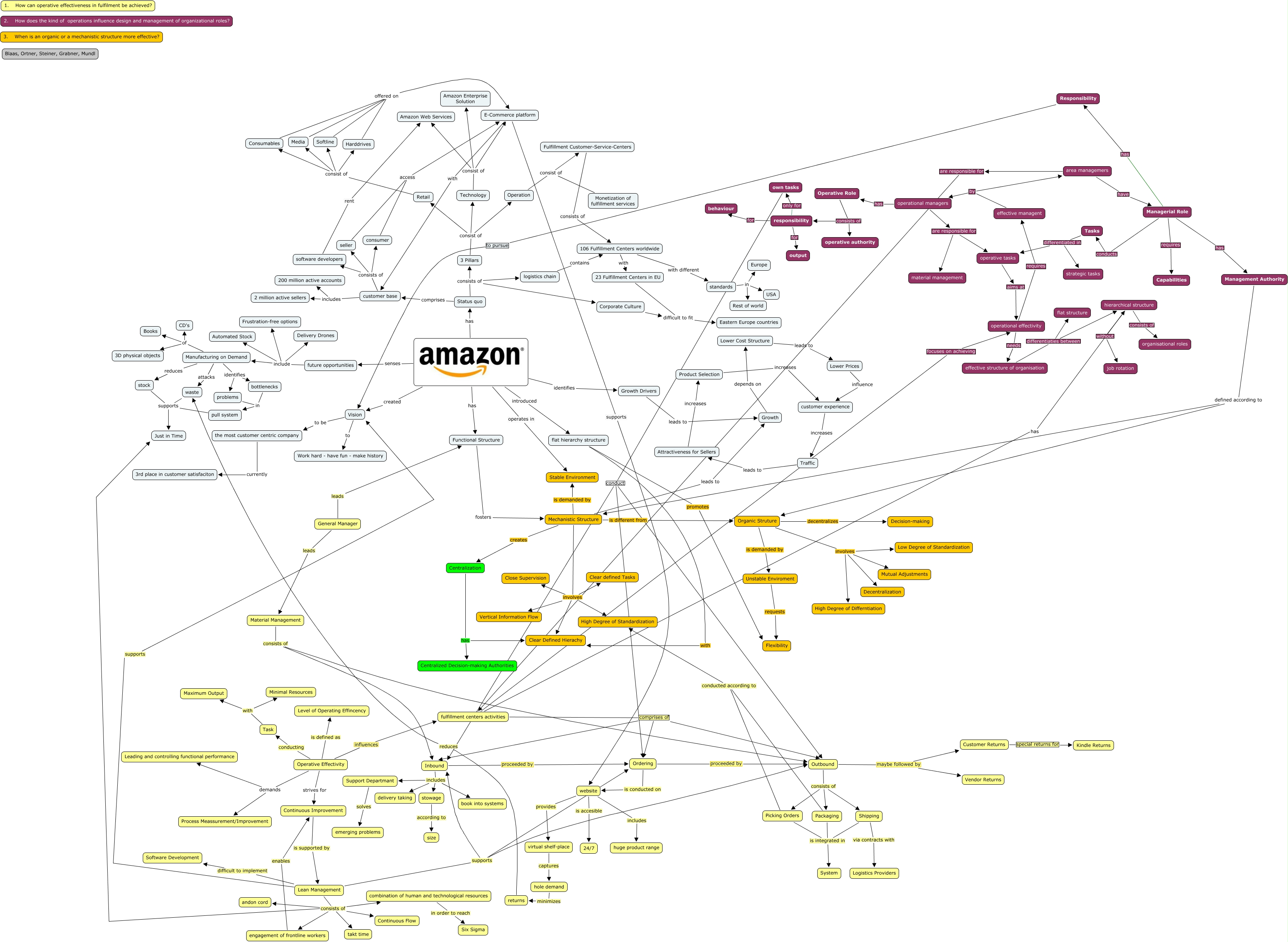 Dieses mit IHMC CmapTools erstellte CMap hat Informationen bezüglich: AMAZON_initial_map_June 16th, Functional Structure fosters Mechanistic Structure, Lower Cost Structure leads to Lower Prices, has Status quo, Manufacturing on Demand attacks waste, Manufacturing on Demand of 3D physical objects, customer base consists of seller, customer base includes 200 million active accounts, Mechanistic Structure creates Centralization, Managerial Role has Responsibility, Mechanistic Structure is demanded by Stable Environment, Status quo consists of logistics chain, website is accesible 24/7, Status quo consists of 3 Pillars, problems in pull system, Manufacturing on Demand reduces stock, customer base includes 2 million active sellers, Centralization has Clear Defined Hierachy, Growth Drivers leads to Growth, Packaging conducted according to High Degree of Standardization, future opportunities include Manufacturing on Demand