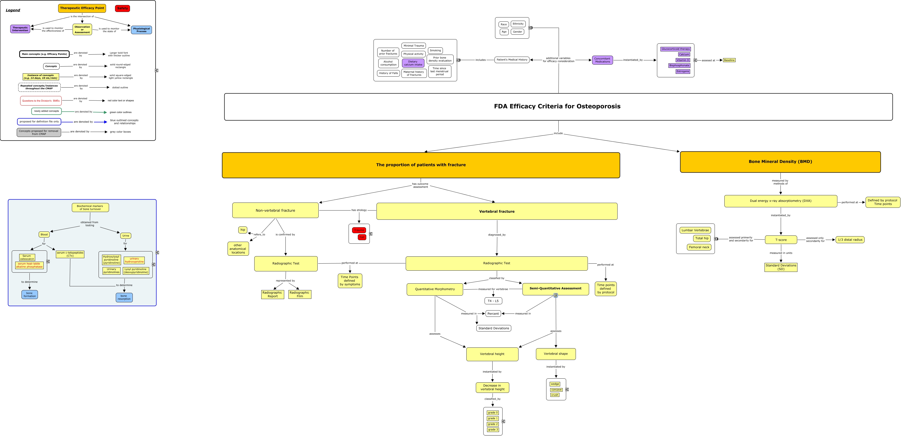 This Concept Map, created with IHMC CmapTools, has information related to: Osteoporosis Efficacy Criteria v7, Concepts proposed for removal from CMAP are denoted by grey color boxes, Dual energy x-ray absorptiometry (DXA) performed at Defined by protocol Time points, Concomitant Medications instantiated_by Concomitant Medications, FDA Efficacy Criteria for Osteoporosis additional variables for efficacy consideration Concomitant Medications, T-score assessed only secondarily for 1/3 distal radius, Radiographic Test performed at Time points defined by protocol, Blood for serum biomarkers, T-score measured in units Standard Deviations (SD), Radiographic Test classified by Quantitative Morphometry, Biochemical markers of bone turnover obtained from testing Urine, Concepts are denoted by solid round-edged rectangle, Radiographic Test performed at Time Points defined by symptoms, Non-vertebral fracture is confirmed by Radiographic Test, Semi-Quantitative Assessment assesses Vertebral shape, Vertebral shape instantiated by Types of vertebral shapes, Semi-Quantitative Assessment measured for vertebrae T4 - L5, Blood for serum c-telopeptides (CTx), Biochemical markers of bone turnover obtained from testing Blood, The proportion of patients with fracture has outcome assessment Non-vertebral fracture, Radiographic Test classified by Semi-Quantitative Assessment
