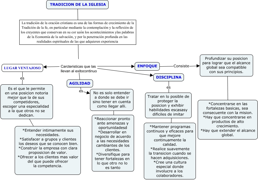 Este Cmap, tiene información relacionada con: Actividad 11cFE CRISTIANA, Tratar en lo posible de proteger la posicion y exhibir habilidades escasasy dificiles de imitar ???? *Mantener programas continuos y eficaces para que mejore continuamente la calidad. *Realice suavemente la transicion cuando se hacen adquisiciones. *Cree una cultura especial donde involucre a los colaboradores., AGILIDAD es No es solo entender a donde se debe ir sino tener en cuenta como llegar alli., La tradición de la oración cristiana es una de las formas de crecimiento de la Tradición de la fe, en particular mediante la contemplación y la reflexión de los creyentes que conservan en su cor azón los acontecimientos ylas palabras de la Economía de la salvación, y por la penetración profunda en las realidades espirituales de las que adquieren experiencia Carcteristicas que las llevan al exitocontinuo DISCIPLINA, La tradición de la oración cristiana es una de las formas de crecimiento de la Tradición de la fe, en particular mediante la contemplación y la reflexión de los creyentes que conservan en su cor azón los acontecimientos ylas palabras de la Economía de la salvación, y por la penetración profunda en las realidades espirituales de las que adquieren experiencia Carcteristicas que las llevan al exitocontinuo LUGAR VENTAJOSO, La tradición de la oración cristiana es una de las formas de crecimiento de la Tradición de la fe, en particular mediante la contemplación y la reflexión de los creyentes que conservan en su cor azón los acontecimientos ylas palabras de la Economía de la salvación, y por la penetración profunda en las realidades espirituales de las que adquieren experiencia Carcteristicas que las llevan al exitocontinuo AGILIDAD, Profundizar su posicion para lograr que el alcance global sea compatible con sus principios. ???? *Concentrarse en las fortalezas basicas, sea consecuente con la mision. *Hay que concentrarse en productos de alto crecimiento. *Hay que extender el alcance global., ENFOQUE Consiste Profundizar su posicion para lograr que el alcance global sea compatible con sus principios., TRADICION DE LA IGLESIA es La tradición de la oración cristiana es una de las formas de crecimiento de la Tradición de la fe, en particular mediante la contemplación y la reflexión de los creyentes que conservan en su cor azón los acontecimientos ylas palabras de la Economía de la salvación, y por la penetración profunda en las realidades espirituales de las que adquieren experiencia, La tradición de la oración cristiana es una de las formas de crecimiento de la Tradición de la fe, en particular mediante la contemplación y la reflexión de los creyentes que conservan en su cor azón los acontecimientos ylas palabras de la Economía de la salvación, y por la penetración profunda en las realidades espirituales de las que adquieren experiencia Carcteristicas que las llevan al exitocontinuo ENFOQUE, DISCIPLINA es Tratar en lo posible de proteger la posicion y exhibir habilidades escasasy dificiles de imitar, No es solo entender a donde se debe ir sino tener en cuenta como llegar alli. ???? *Reaccionar pronto ante amenazas y oportunidadesd *Desarrollar en negocio de acuerdo a las necesidades cambiantes de los clientes. *Diversifique para tener fortalezas en lo que otro no lo es tanto, LUGAR VENTAJOSO es ????, Es el que le permite en una posicion notoria mejor que la de sus competidores, escoger una especialidad a la que otros no se dedican. ???? *Entender intimamente sus necesidades. *Satisfacer a grupos y clientes los deseos que se conocen bien. *Construir la empresa con clara proposicion de valor. *Ofrecer a los clientes mas valor del que puede ofrecer la competencia.